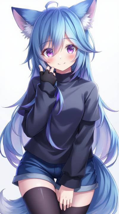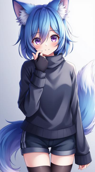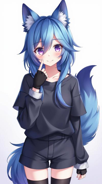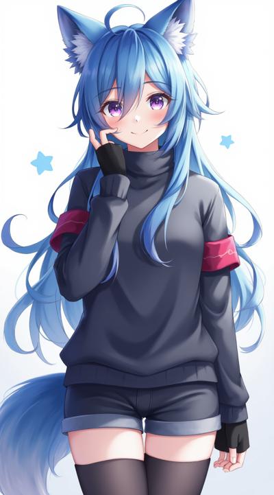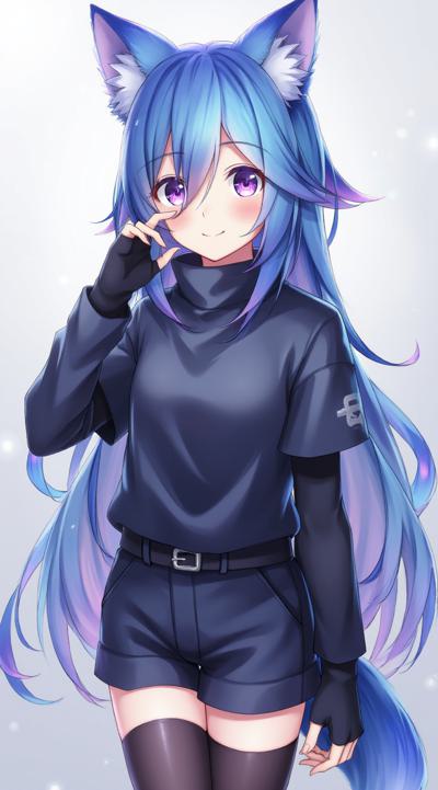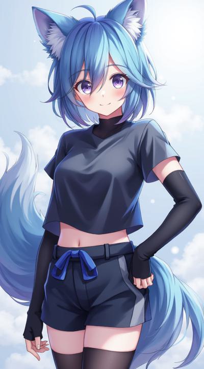 Аниме девушка с синими волосами, лисьими лазуревыми ушами, лисьим хвостом. Одета в темно-серый топик и шорты, а также длинные перчатки до рукавов (перчатки без пальцев) и темно-серые колготки до колен.