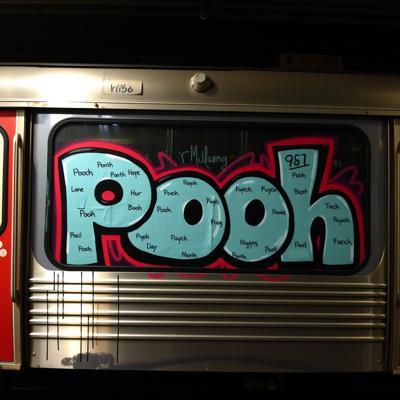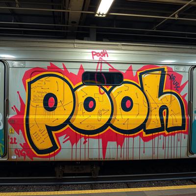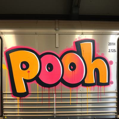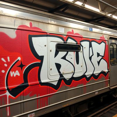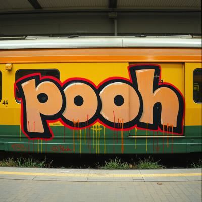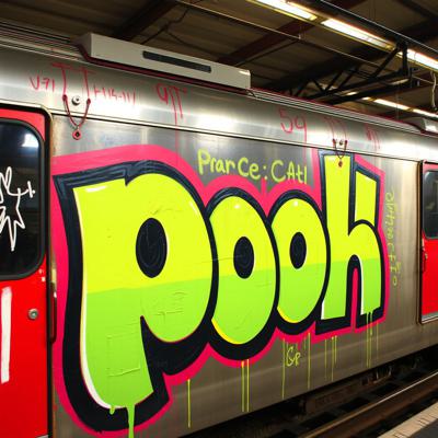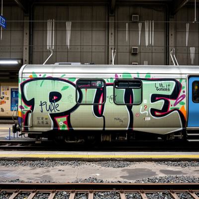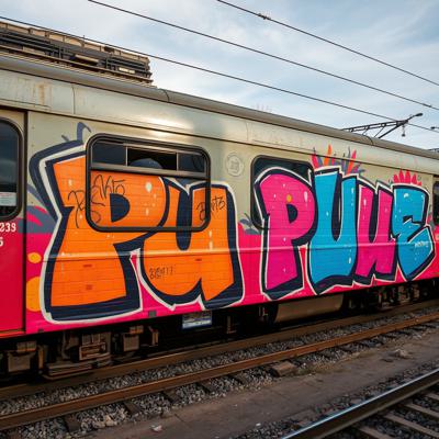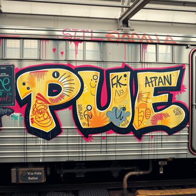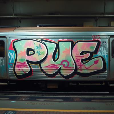 Создай граффити картину большого масштаба, три буквы на поезде., Буквы: PUE