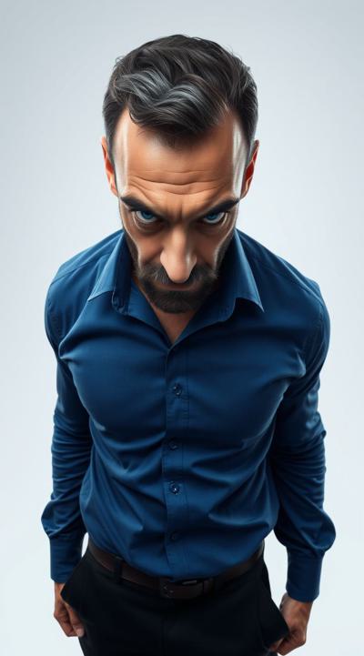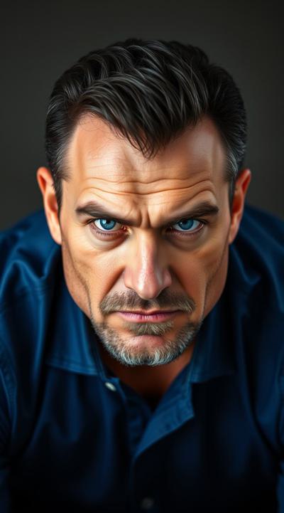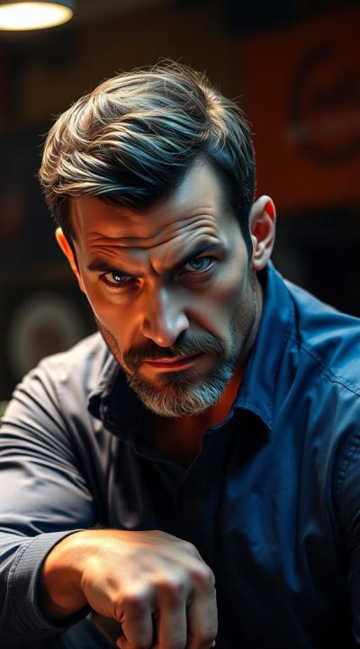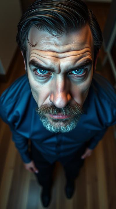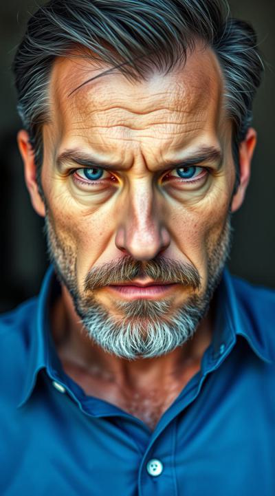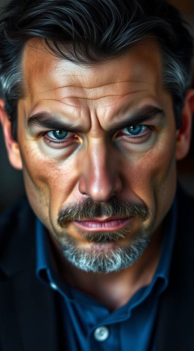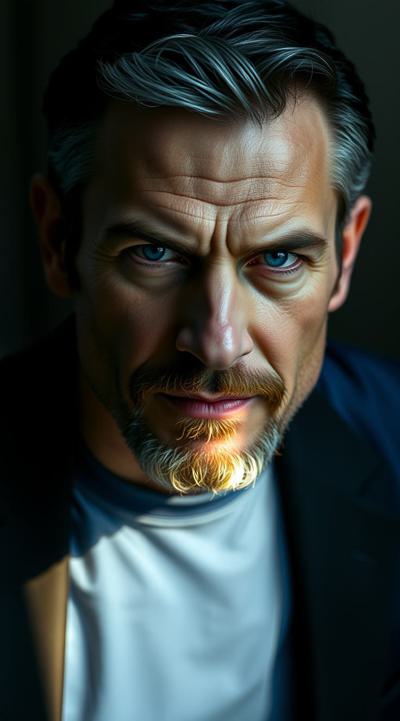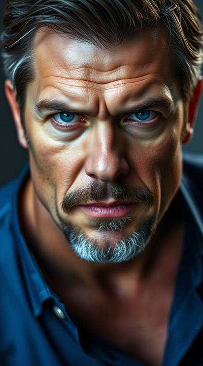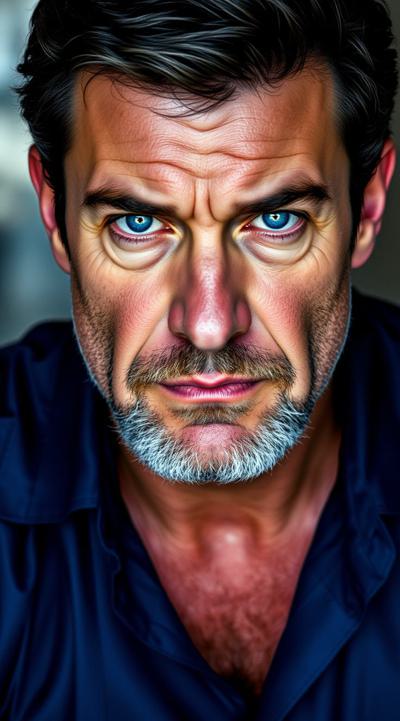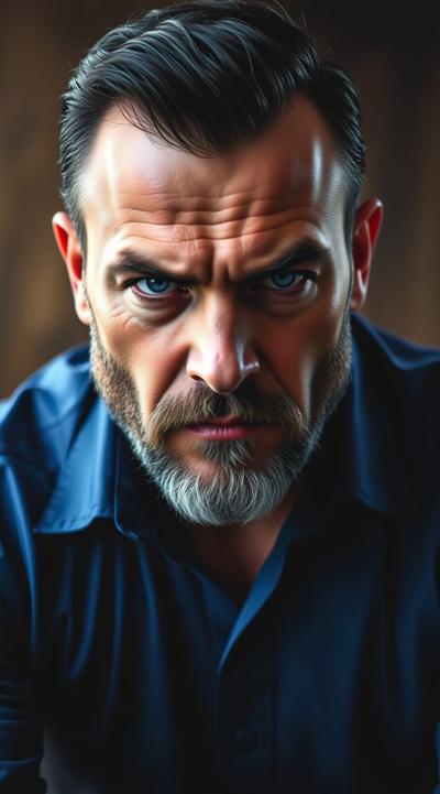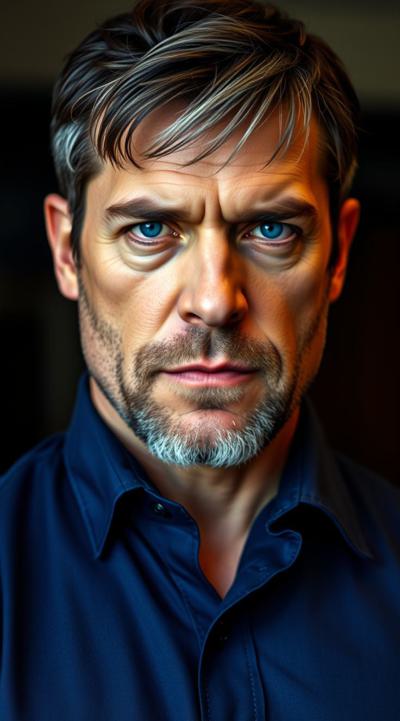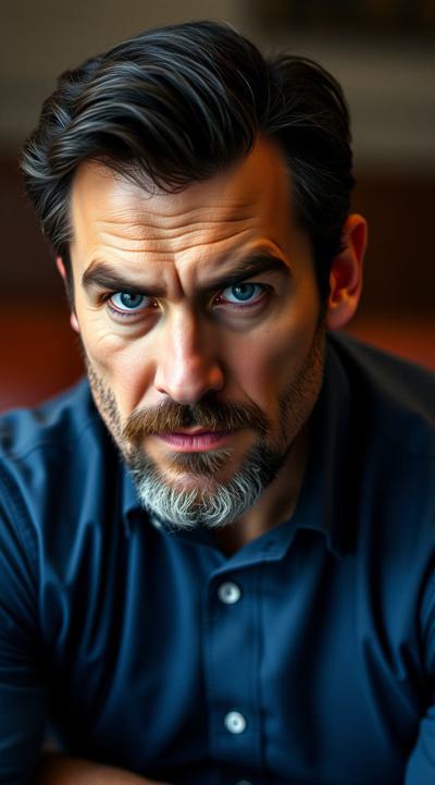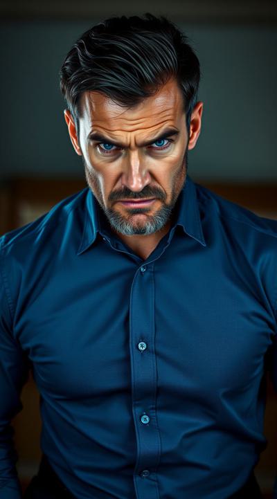 Взрослый, видный мужчина, харизматичный, грозный взгляд ярких синих глаз. Ухоженный, почти без морщин. Тёмные волосы, небольшая борода с проседью. Хорошо сложен, накачен. В синей рубашке с длинными рукавами и чёрных брюках