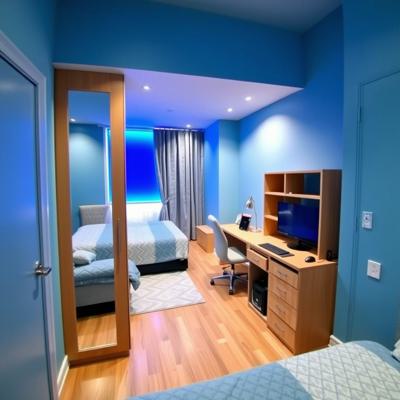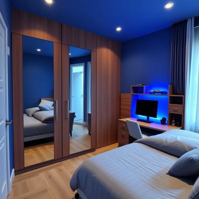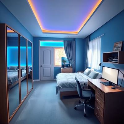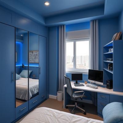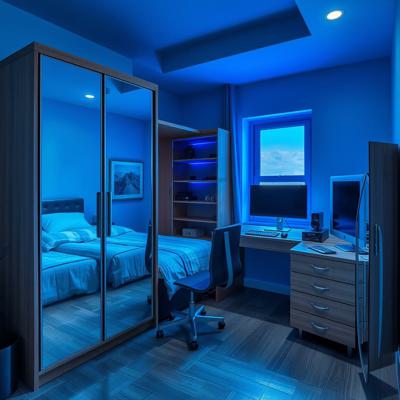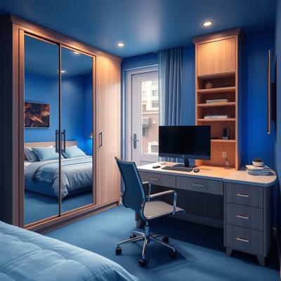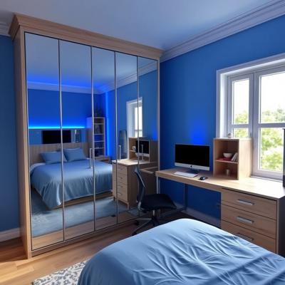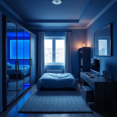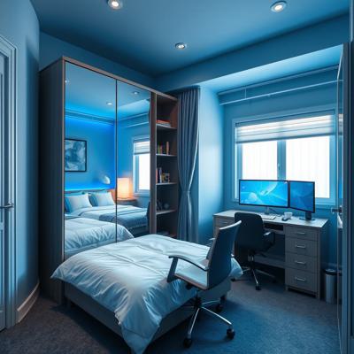 Интерьер комнаты для вебкам стрима в синих тонах с зеркальным шкафом двуспальной кроватью, удобным компьютерным столом, которого есть полочки и ящики. С синей подсветкой. Окно напротив двери