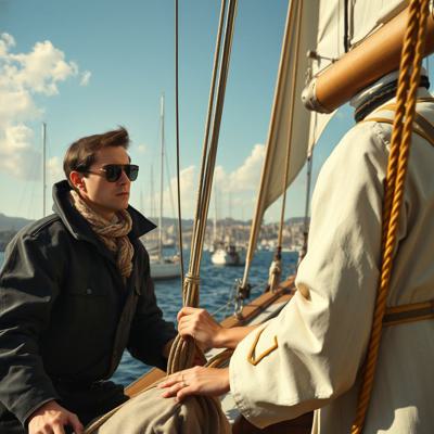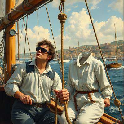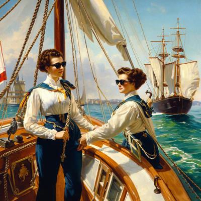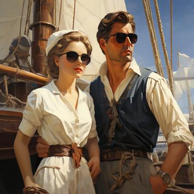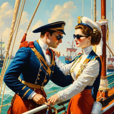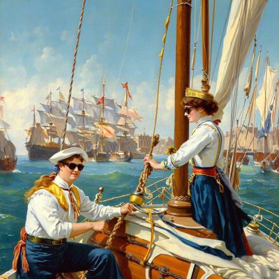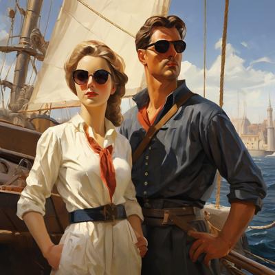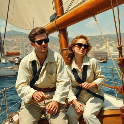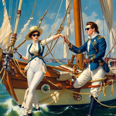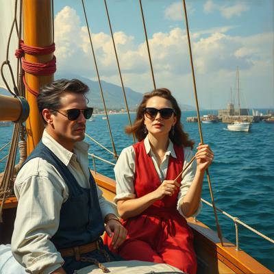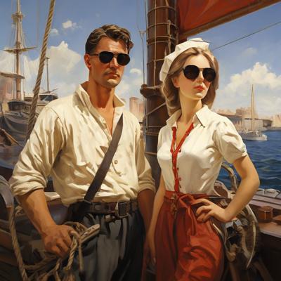 СРЕДНЕВЕКОВАЯ КЛАССИЧЕСКАЯ ЖИВОПИСЬ . МУЖЧИНА И ЖЕНЩИНА В СОЛНЕЧНЫХ ОЧКАХ АРИСТОКРАТЫ 1950 ГОДОВ ОДЕТЫ В СПОРТИВНУЮ ФОРМУ ЯХТСМЕНОВ ЗАНЯТЫ УПРАВЛЕНИЕМ ТАКЕЛАЖА ЯХТЫ НА ФОНЕ БОЛЬШОГО МОРСКОГО ПОРТА