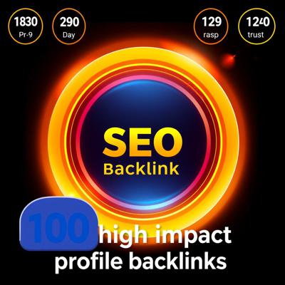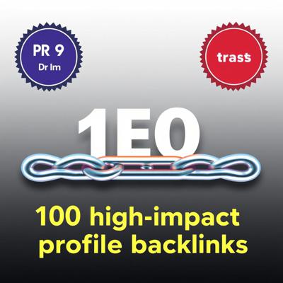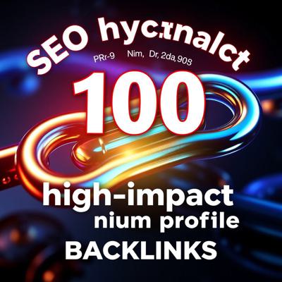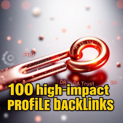 Create a glossy, professional image showcasing high-quality SEO backlinks. The central focus should be a visual representation of a premium backlink with metrics like PR-9, DR , DA , and Trust . Incorporate the following text prominently on the image: 100 High-Impact Profile Backlinks ., Use a color scheme inspired by Ahrefs: the letter A in orange, hrefs in white. The DA metric should be in white with a light blue outline. Include the word Majestic in white, positioned above five red stars with yellow outlines to emphasize top-tier quality. The overall design should convey trust, authority, and premium SEO services.