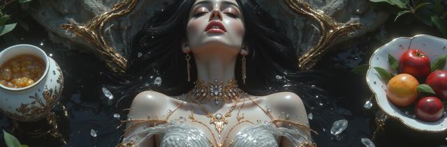 женщина вампир, темные густые волосы, тонкая талия, широкие бедра, пышные формы, тонкая золотая украшение украшает голову и тело, подвески кристаллы, большая купель-бассейн, отдыхает в воде, вода кристально прозрачная, столик с блюдом из керамики заполненной фруктами, локация цветущий сад, античная архитектура, мраморные колонны, пол выложен из разноцветной мозаики, легкий ветер, темная ночь, звезды на ночном небе, растущая луна, мягкие облака, динамическое освещение, полумрак.