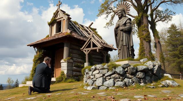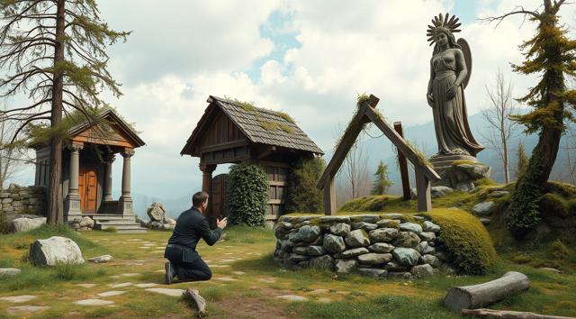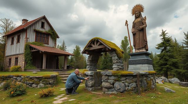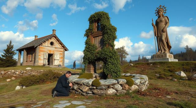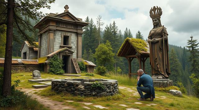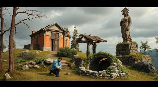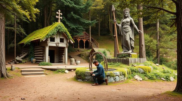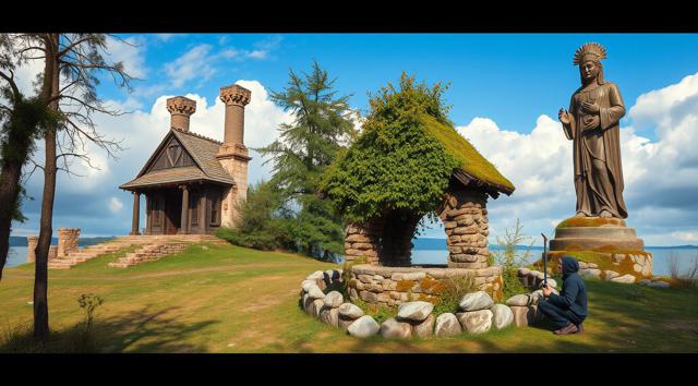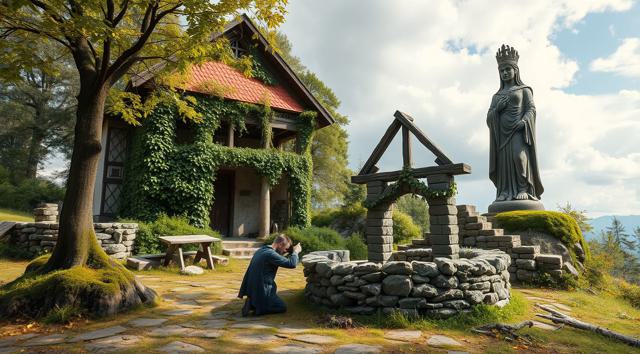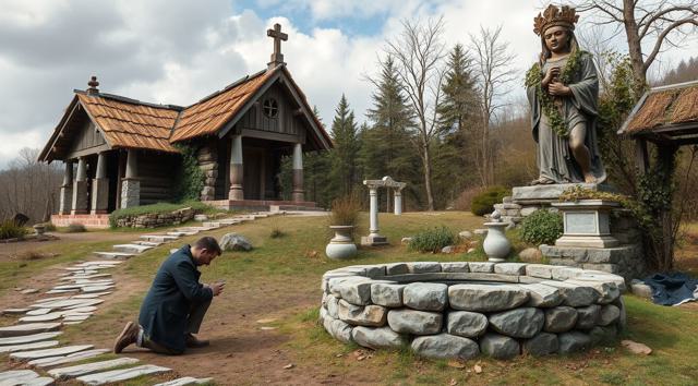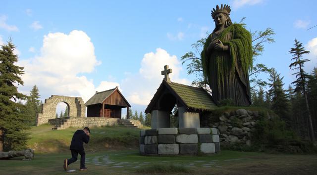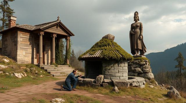 , На краю капища -развалины деревянной часовни дохристианских времен. Справа от неё стоит огромная деревянная статуя богини Морена. Чуть в стороне - круглый колодец, сложенный из камней, без крыши, увитый плющом и обросший мхом. Пушкин Александр Сергеевич (создать портретное сходство!) стоит на коленях у колодца. Он одет в исподнее, белую рубаху и серую жилетку. С его рук капает вода, а сам он напряженно смотрит вглубь колодца, как будто увидел там что-то