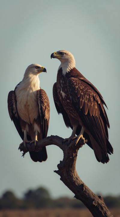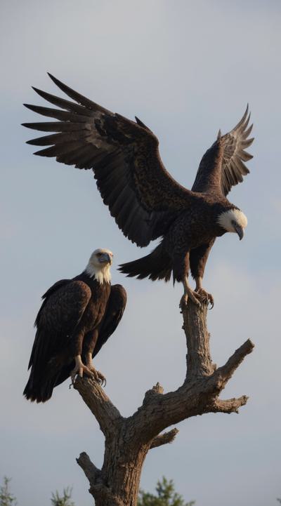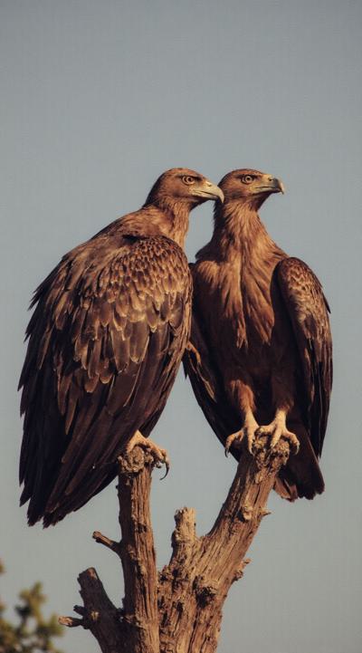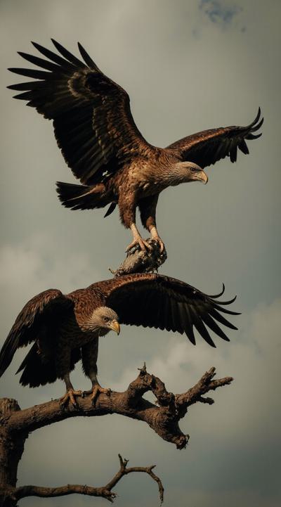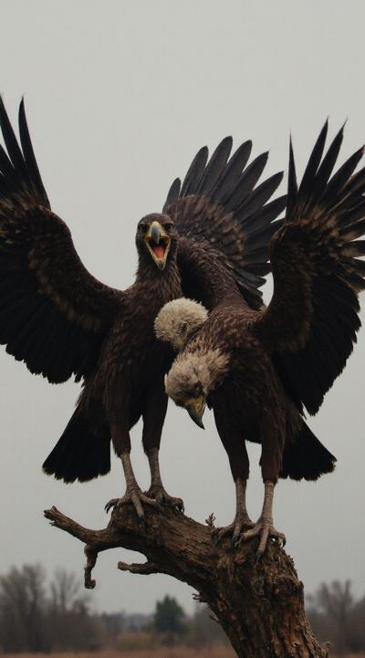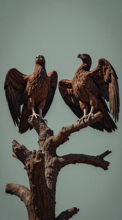 Две крупные птицы Грифы с приподнятыми крыльями. немного открытый клюв. Сидят на ветке. ждут свою умирающею жертву