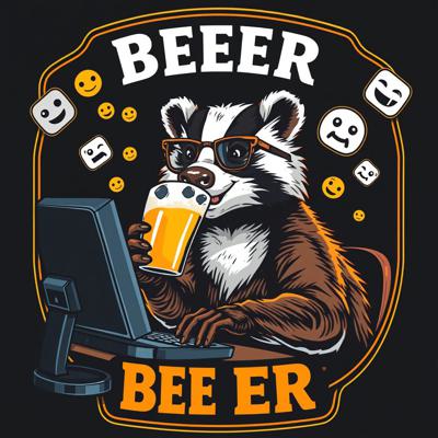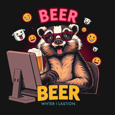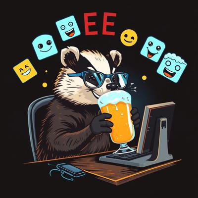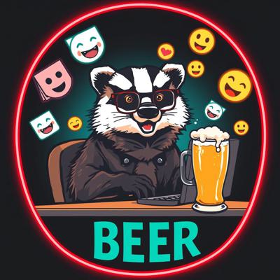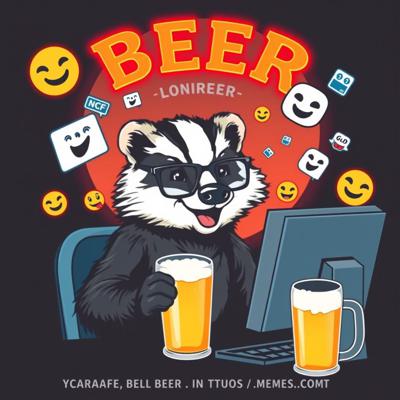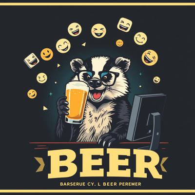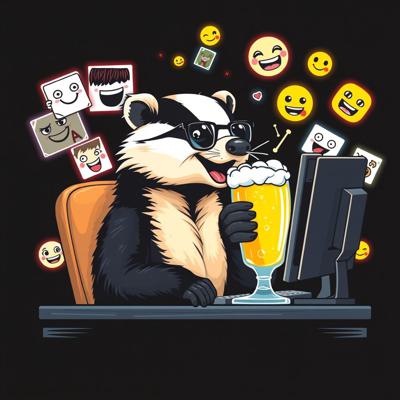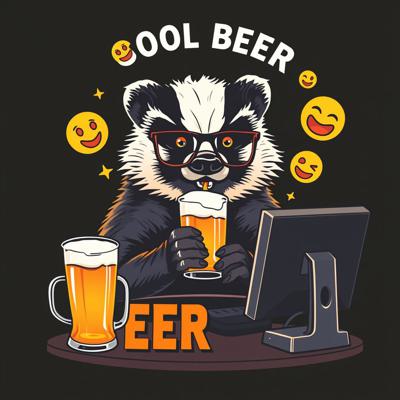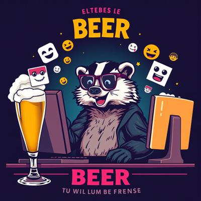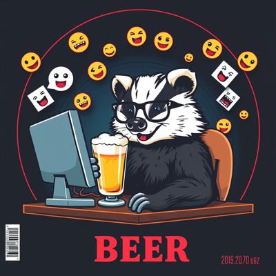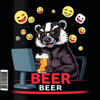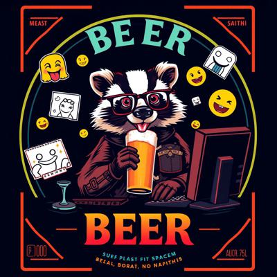 Крутая пивная этикетка в стиле лоу-фай, на этикетке нарисован веселый барсук в очках, который сидит за компьютером и пьет пиво, вокруг него летают мемные картинки и смайлики, пивные бокалы, темный фон, неон, винтаж, детализировано.