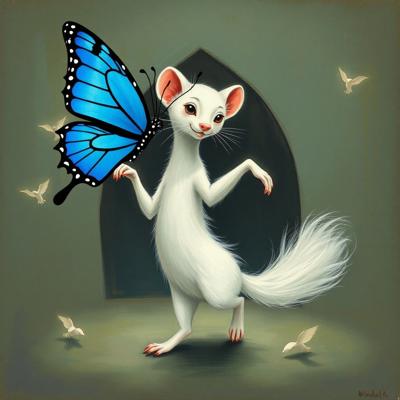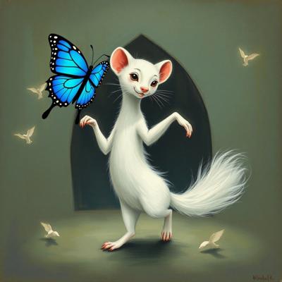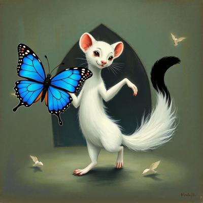 добавить синюю бабочку и черный кончик хвоста [Уточнение для #6256312 'белый горностай танцует ]'