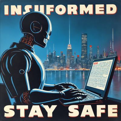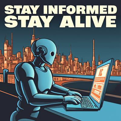 робот постит новости в телеграм за ноутбуком на фоне ночного города.