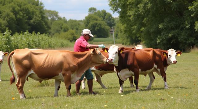 Солнечный летний день, ферма. Фермер с руки кормит корову.