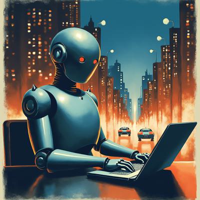 робот за ноутбуком на фоне ночного города.