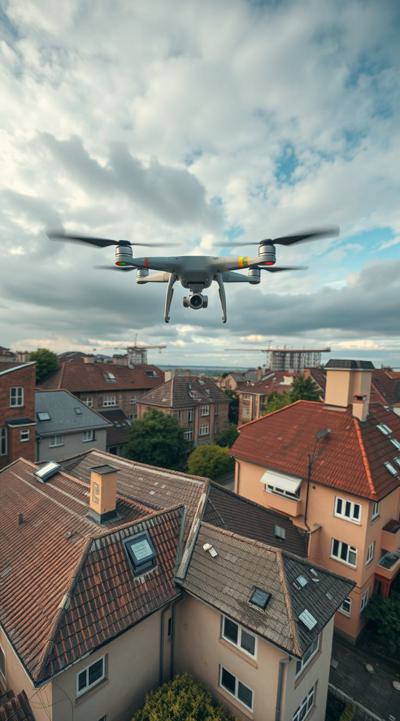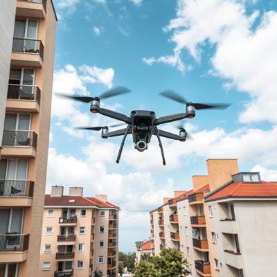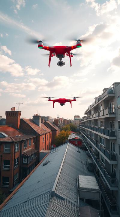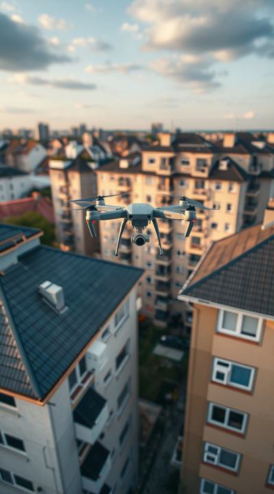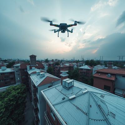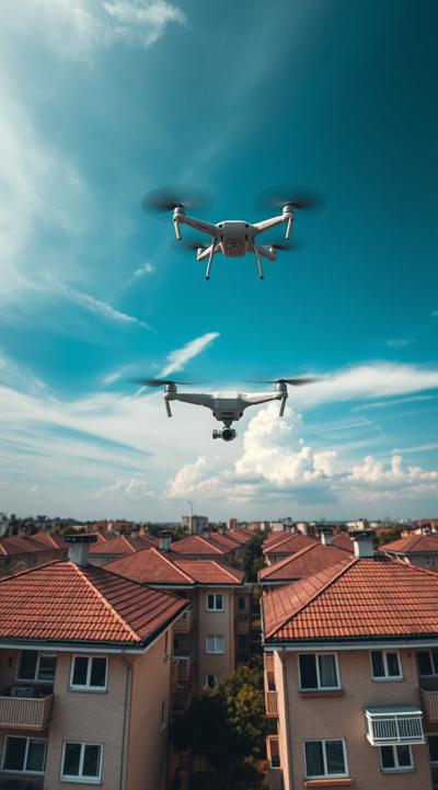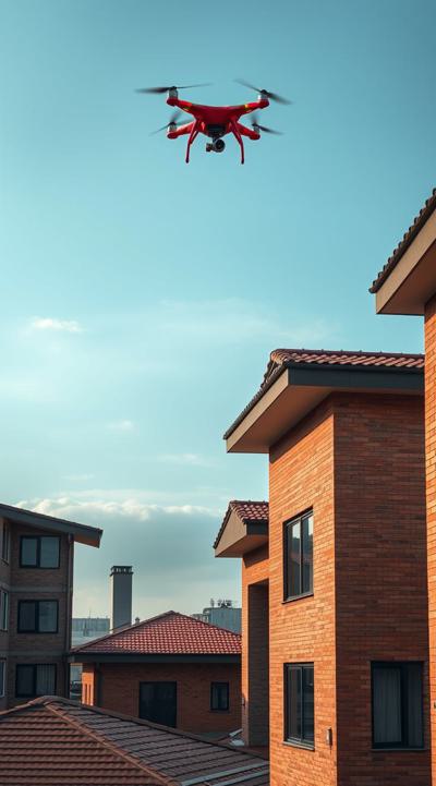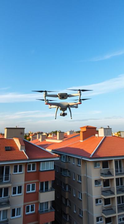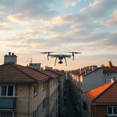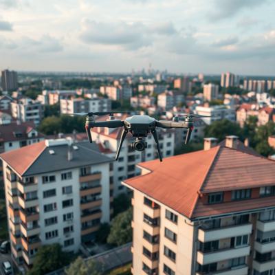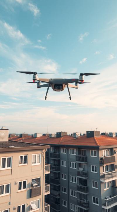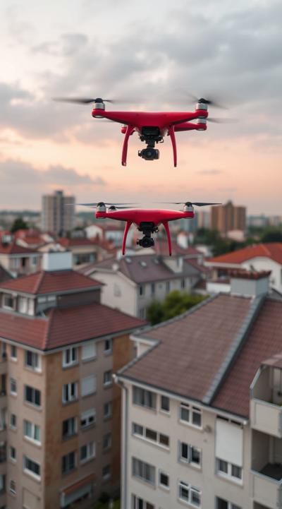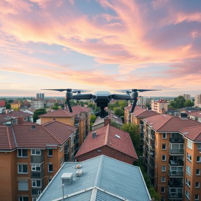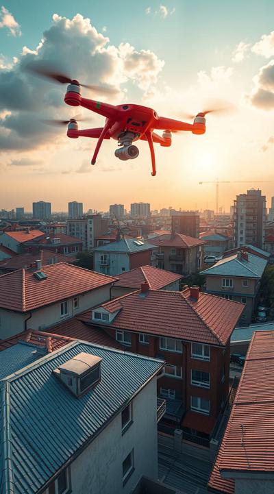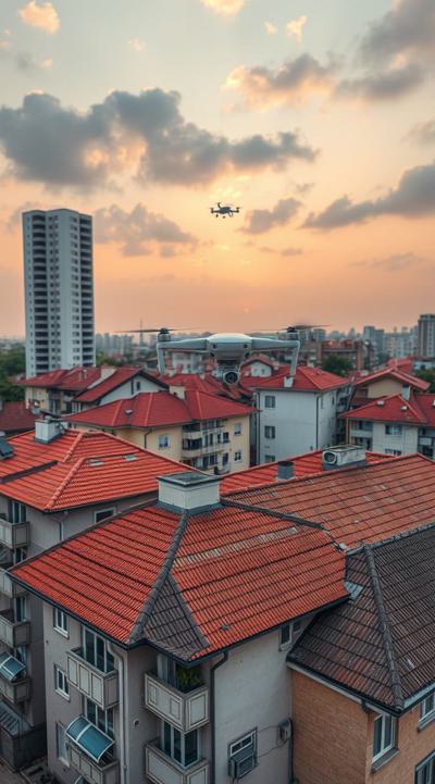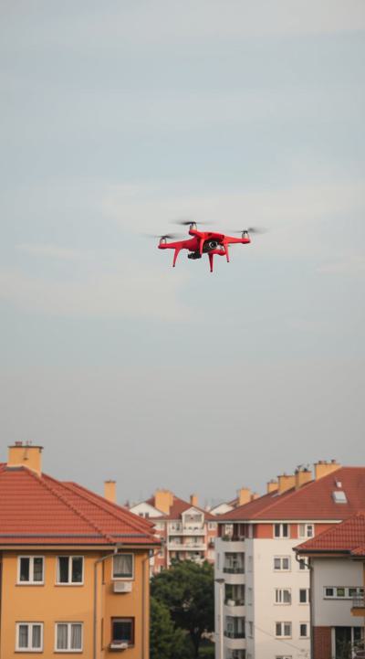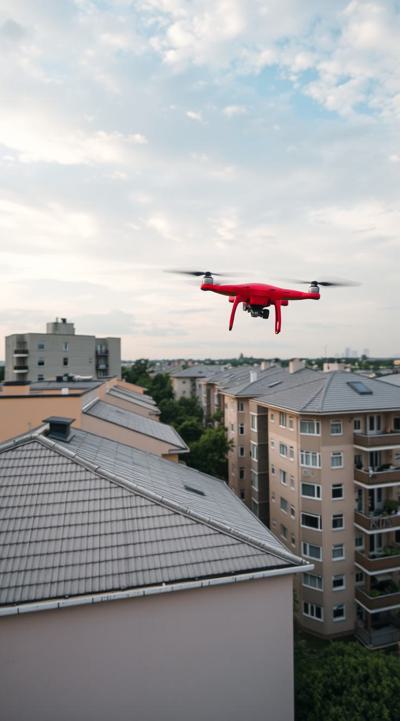крыши многоквартирных домов, в небе летит красный беспилотник