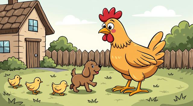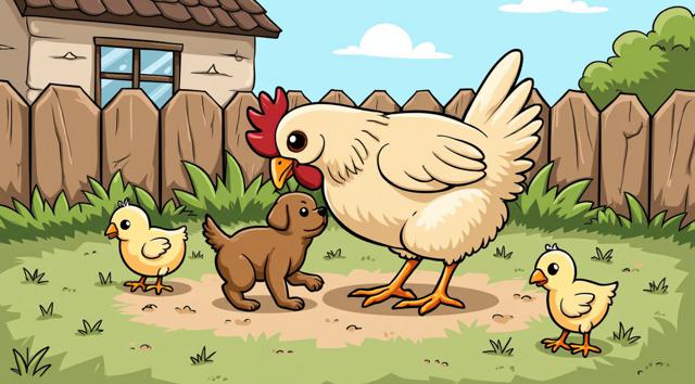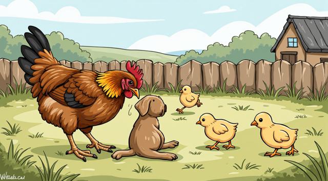 ЯРКИЙ РИСОванный мультфильм: охристая курица-наседка клюёт маленького щенка на деревенском дворе. рядом бегают только что вылупившиеся маленькие светло- жёлтые птенцы курицы.