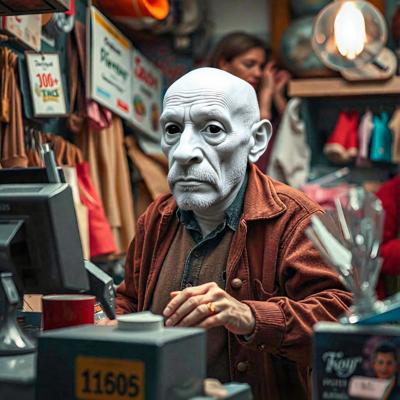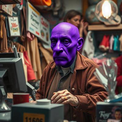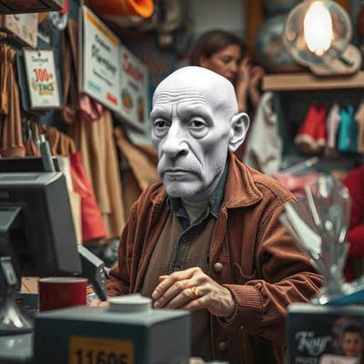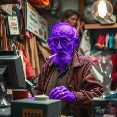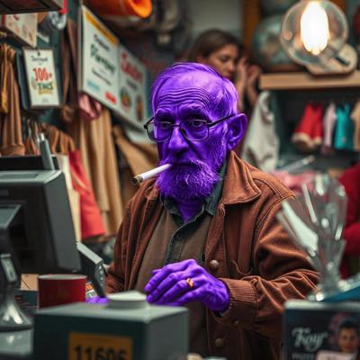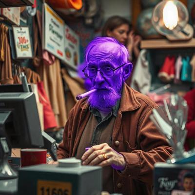 Лысый., Нос фиолетовый боксерский [Уточнение для #6306833 'Убрать волосы, добавить сигарету [Уточнение для #6306832 'Худой старик заа кассовым аппаратом. Старые перекошенгый очки, небритый, седая короткая борода, сигарета. Вокруг товар женский секондхенд. ]']'