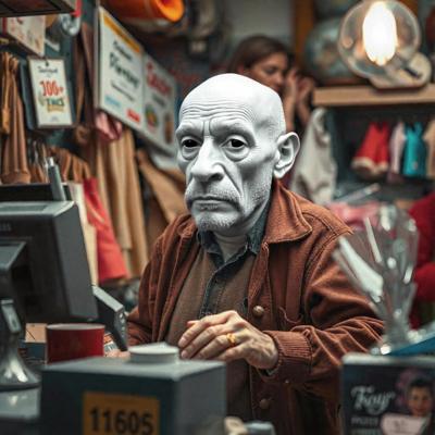 Белое лицо с синяком под глазом [Уточнение для #6306835 'Лысый., Нос фиолетовый боксерский [Уточнение для #6306833 'Убрать волосы, добавить сигарету [Уточнение для #6306832 'Худой старик заа кассовым аппаратом. Старые перекошенгый очки, небритый, седая короткая борода, сигарета. Вокруг товар женский секондхенд. ]']']'
