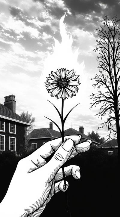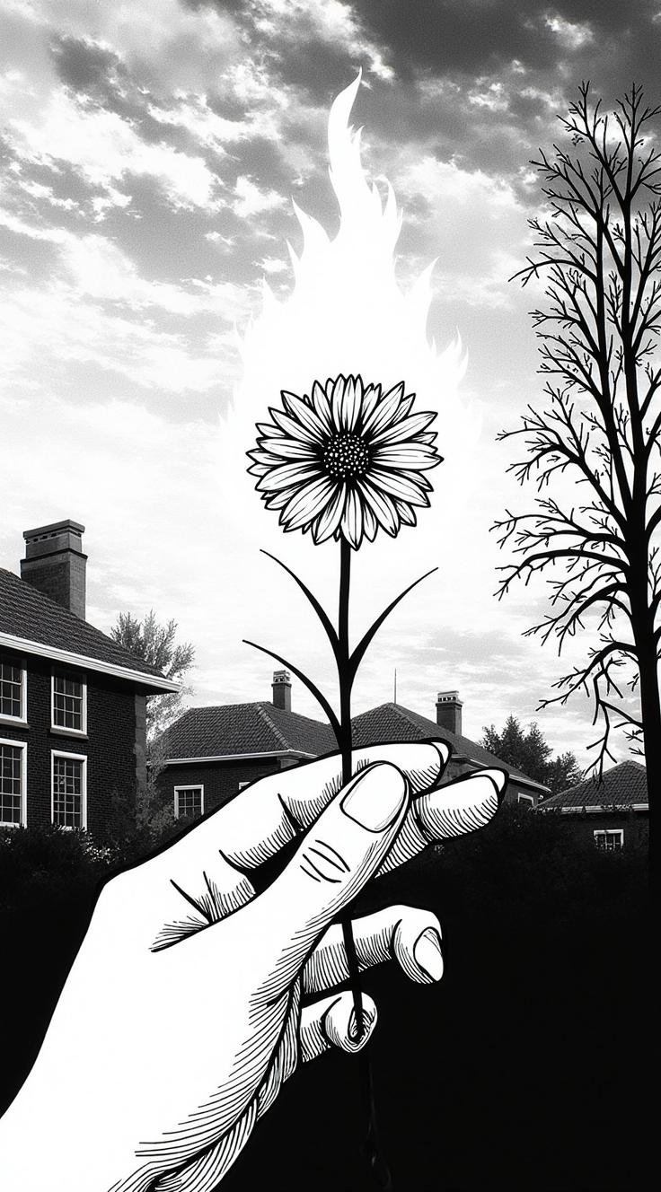 Символическая черно белая гравюра, разделённая на два плана. Драматический контраст близкого жеста и далёкого разрушения., Передний план:, Женская рука (тонкая, с изящными, но напряжёнными пальцами) держит цветок на стебле. Цветок горит. , Задний план: силуэты горящих домов. Не детальные, а размытые, как кошмар обрушенные крыши, остовы башен., Высококонтрастная гравюра. Только чистый чёрный, белый и агрессивная штриховка.