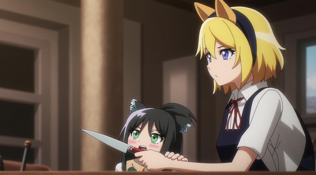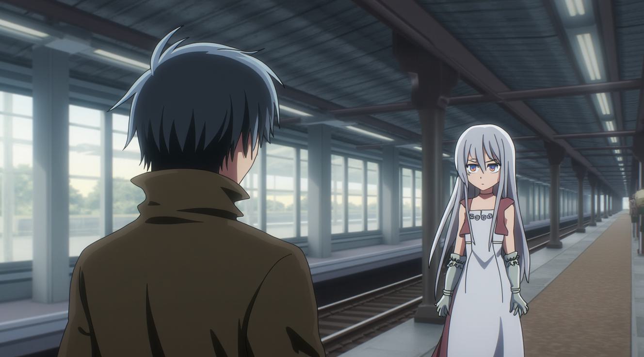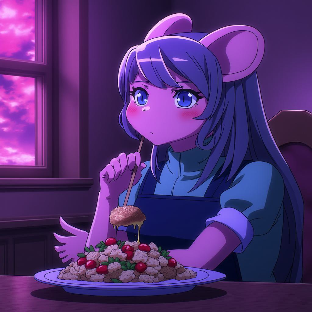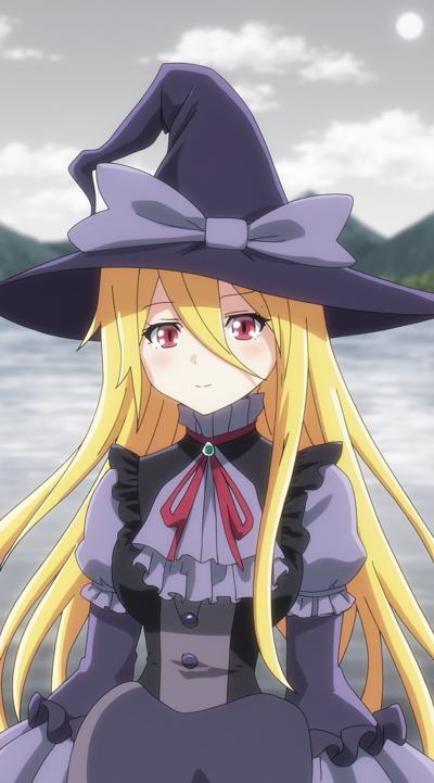 1girl, black headwear, blonde hair, closed mouth, frills, grey background, hair between eyes, hat, high collar, long hair, looking at viewer, portrait, red eyes, simple background, solo, traditional media, upper body, witch, witch hat, cloud, gradient sky, lake, landscape, moon, mountain, mountainous horizon, nature, night, night sky, no humans, outdoors, planet, purple sky, scenery, sky, star (sky), starry sky, sun, sunrise, sunset, twilight, water,