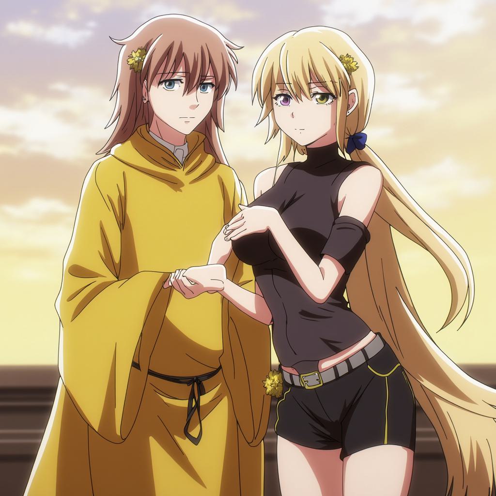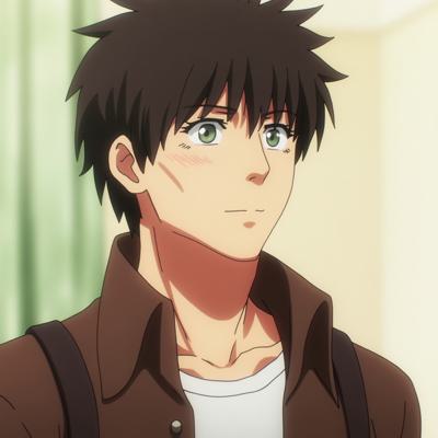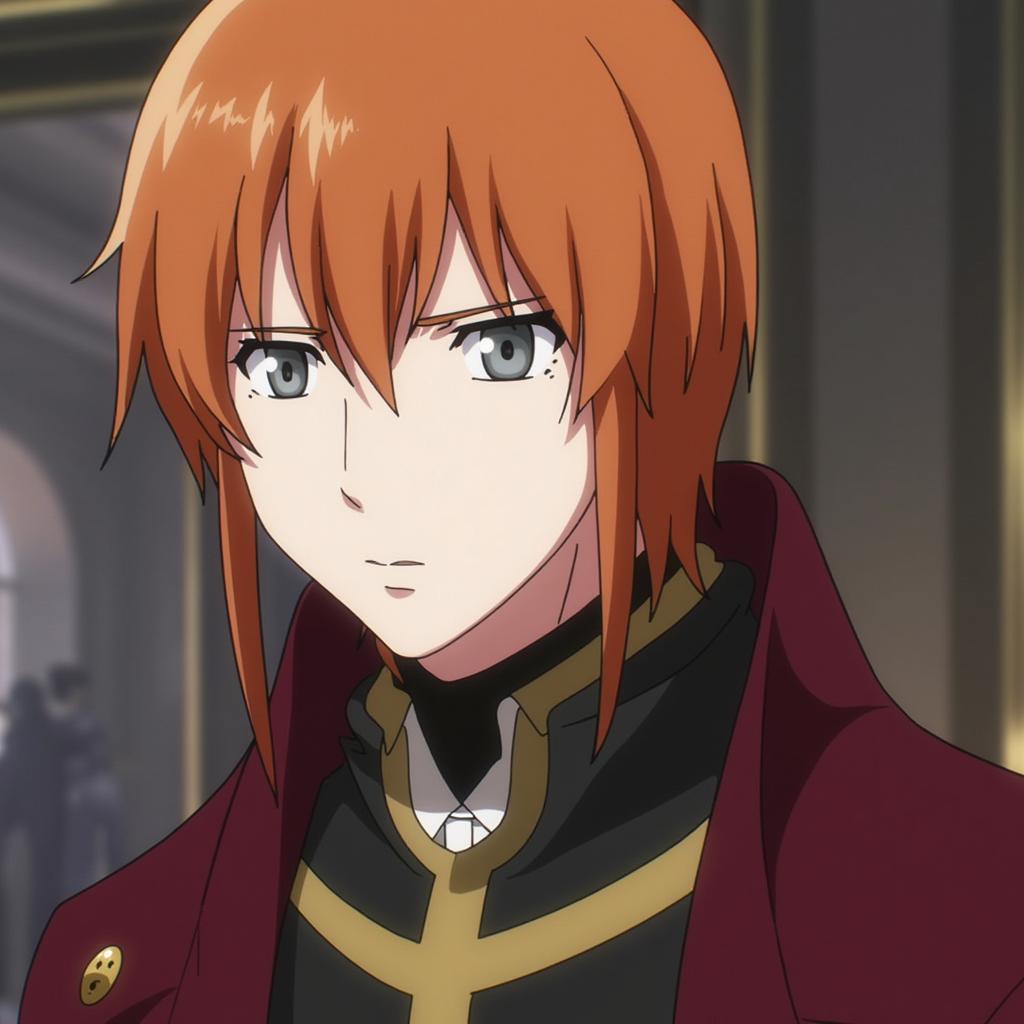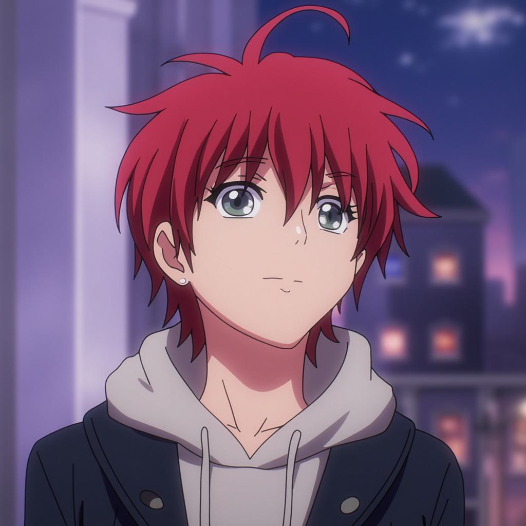 Эмоции: «задумчивый, напряжённый взгляд»., Одежда: «светлая толстовка, тёмная куртка — реалистично прорисовать складки ткани»., Фон: «боке-эффект, мягкие фиолетово-голубые тона, урбанистический стиль»., Второй персонаж: «частично виден, акцент на ярко-рыжие волосы, без деталей лица»., Стиль: «чистый аниме-контур, высокая детализация, акцент на глазах и волосах».