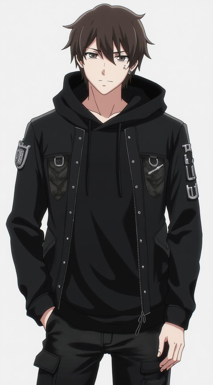 My Hero Academia OC, 15-year-old male villain anti-hero. Teenager with sharp features, wearing a tattered black jacket over a hoodie, baggy pants, and combat boots. Multiple silver studs and hoops in his left ear. A prominent healing cut on his left eyebrow. Menacing but youthful expression. Anime key visual style, detailed linework, vibrant colors.