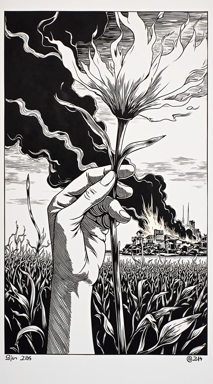 Символическая черно белая гравюра, разделённая на два плана. Драматический контраст близкого жеста и далёкого разрушения., Передний план:, Женская рука (тонкая, с изящными, но напряжёнными пальцами) держит цветок на стебле. Цветок горит. , Задний план: силуэты горящих домов. Не детальные, а размытые, как кошмар обрушенные крыши, остовы башен., Высококонтрастная гравюра. Только чистый чёрный, белый и агрессивная штриховка.