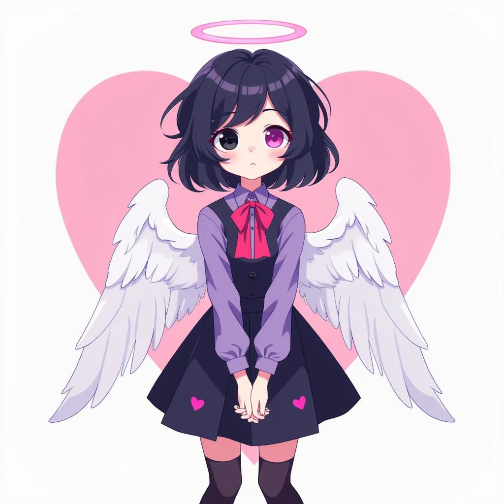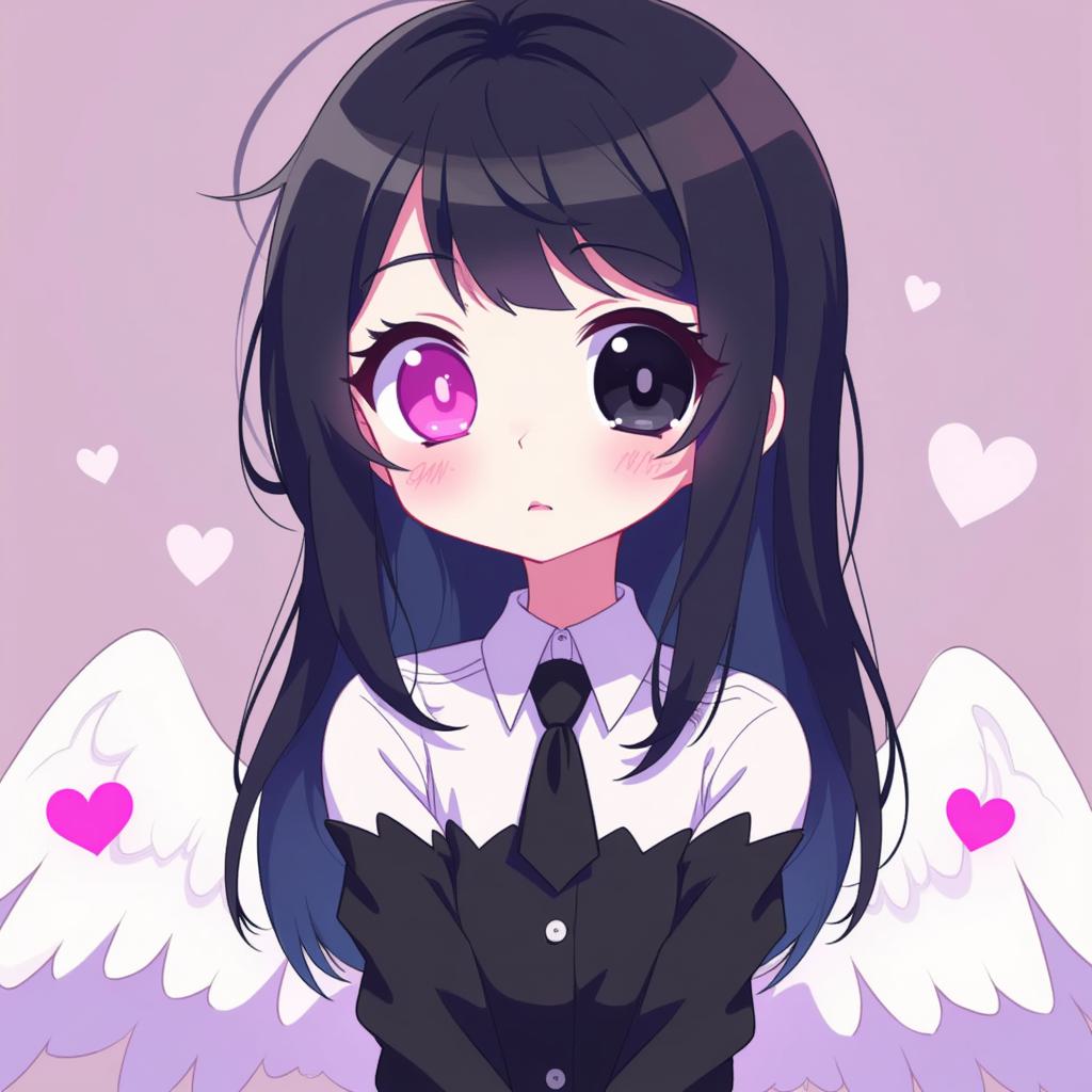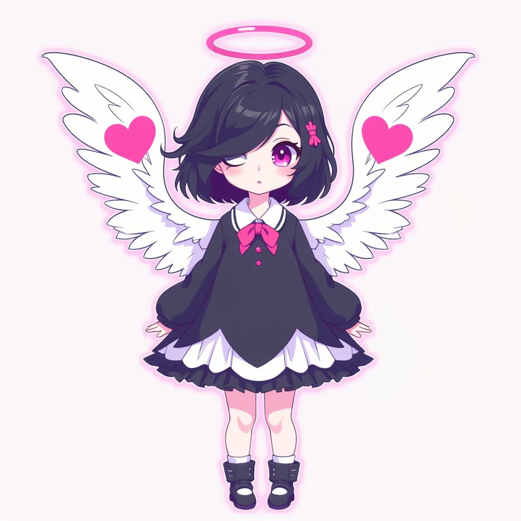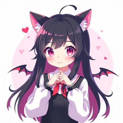 Промпт: Придумала персонажа «Hazbin Hotel Girl», 14 лет, волосы до колен, тёмная, один розовый, другой чёрный, кошачьи ушки на голове, Высокий, с маленькими белыми крылышками, с ярко-розовыми сердечками, белой кожей. 2D-рисунок Волосы длинные., На ней чёрная блузка с белыми рукавами- фонарикам ,и на ладонях перчатки без пальцев