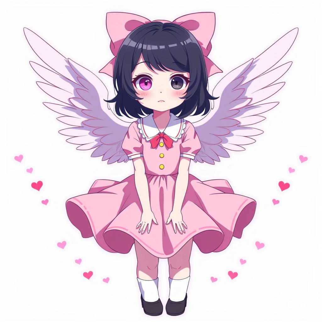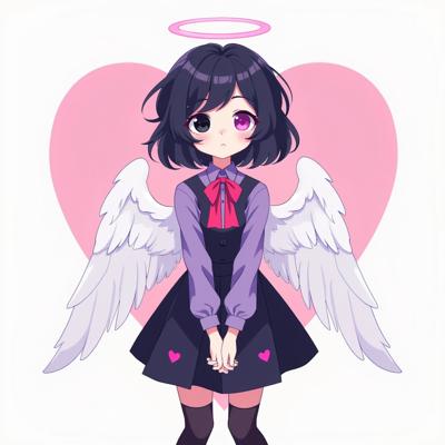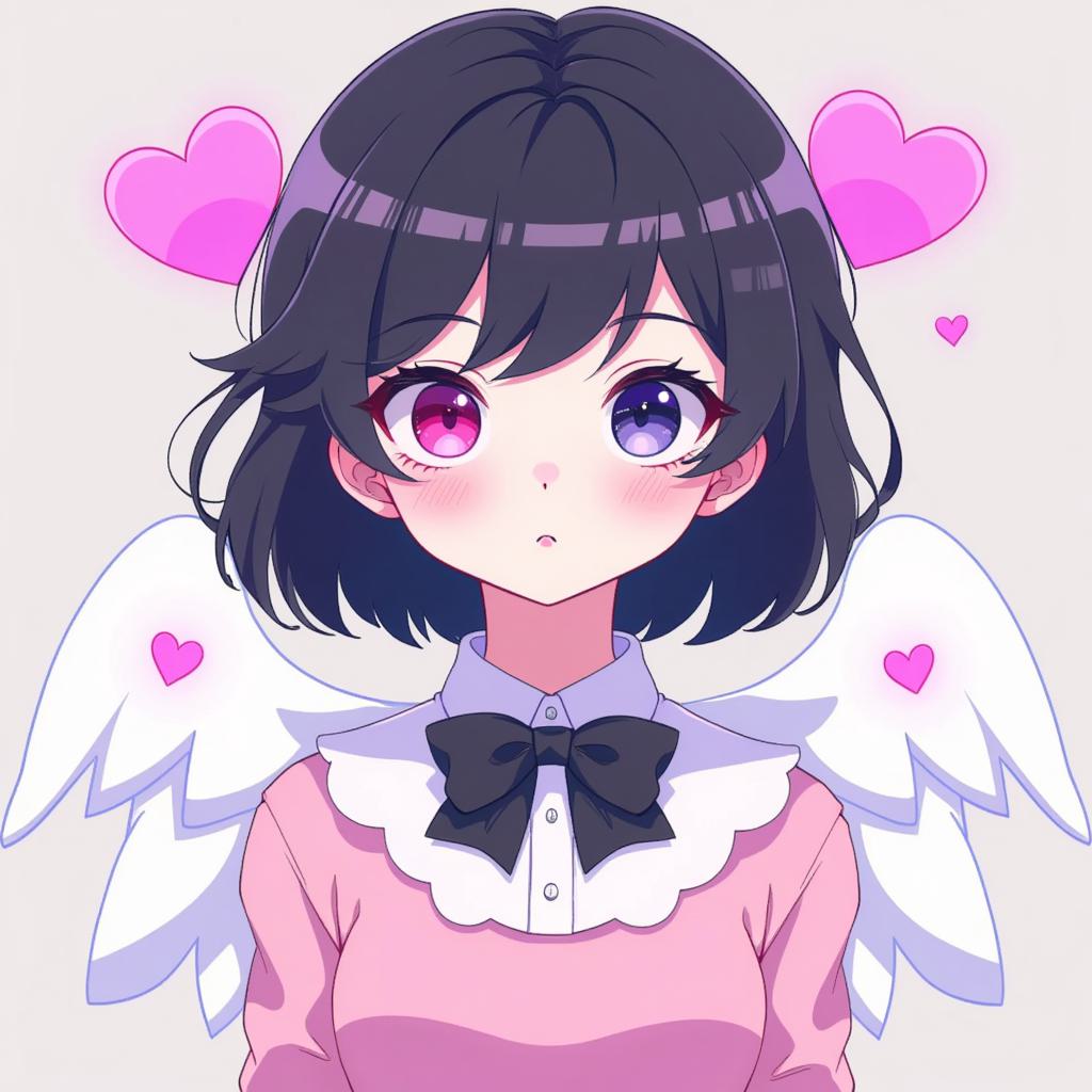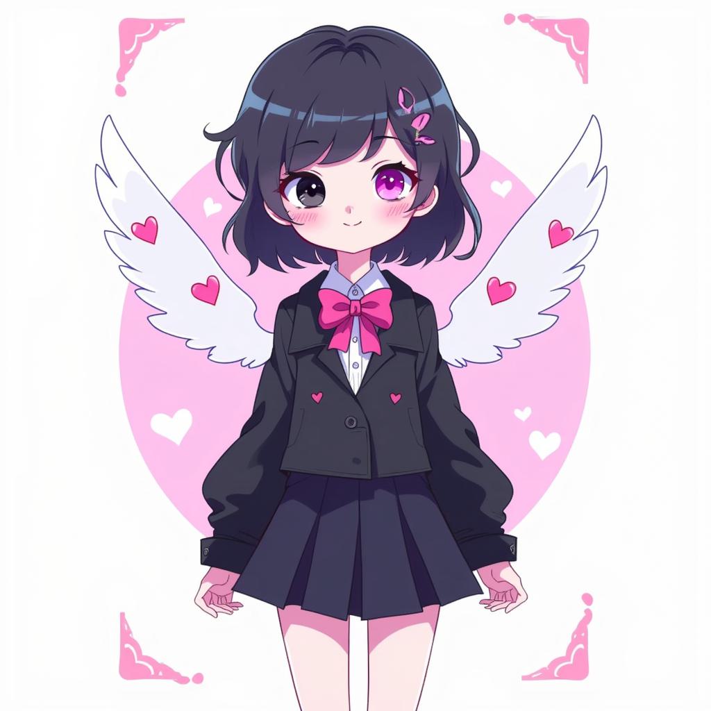 Промпт: Придумала персонажа «Hazbin Hotel Girl», 14 лет, волосы до колен, тёмная, один розовый, другой чёрный, кошачьи ушки на голове, Высокий, с маленькими белыми крылышками, с ярко-розовыми сердечками, белой кожей. 2D-рисунок Волосы длинные., На ней чёрная блузка с белыми рукавами- фонарикам ,и на ладонях перчатки без пальцев
