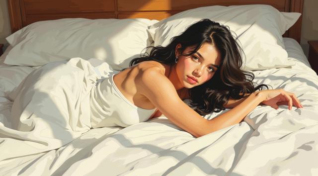 НАРИСУЙ КАРТИНУ В СТИЛЕ Jack Vettriano ТЕХНИКОЙ ШИРОКИМИ МАЗКАМИ С ТЕКСТУРНЫМ НАСЛОЕНИЕМ в стиле КАРТИН Ilene Meyer интимный кадр с точки зрения сверху. 25-летняя женщина с длинными тёмными волосами лежит на животе , облокотившись на локти на большой кровати со светлым бельём. На ней белая простынь, накрывающая груди , которая подчёркивает её фигуру. Её ярко-голубые глаза закрыты, выражение лица — спокойствие. Атмосфера — это тихий отдых и личный покой, освещаемый мягким лунным светом из окна. Фотореалистично, со вкусом, элегантно, с акцентом на контрасте между её фигурой и светлым бельём.
