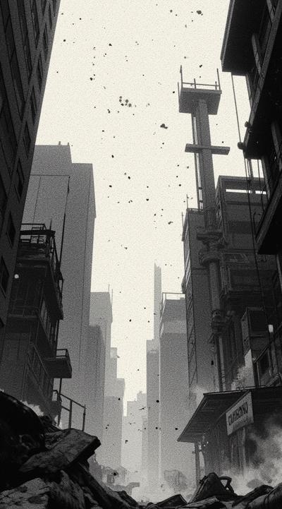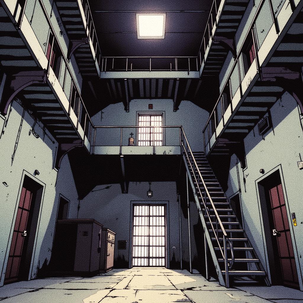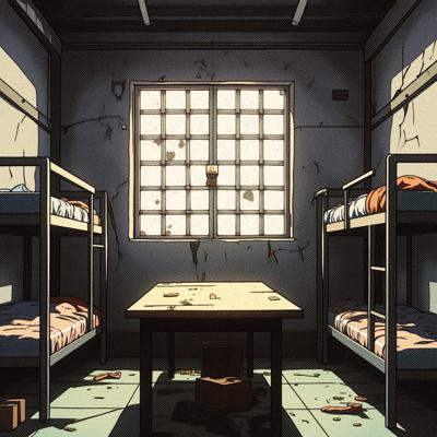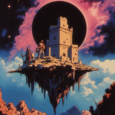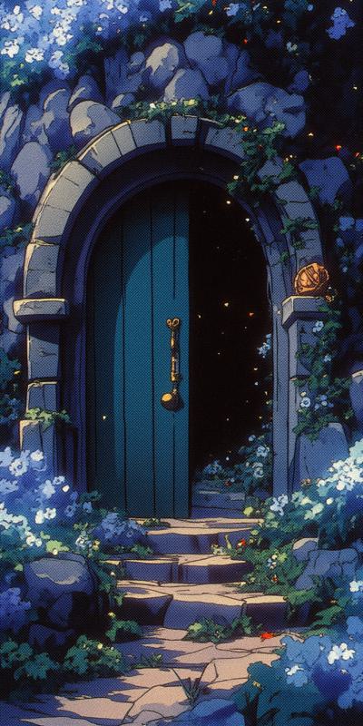 Вход в фентези пещеру. Выглядит как темная без единого лучика света. Одна полудверь сделанная из камня и с различными арнаментами приоткрыта другая закрыта. Двери и скала в которой располагается вход окутаны плющем цветы которого светятся иссиня белыми цветами. Вокруг летают светлячки и по краям картины расположены черные деревья