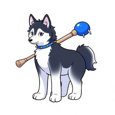 An anthropomorphic furry husky furry. Standin on legs. black and white color, bright blue mallet. a collar with spikes. pretty funny. the image is high-quality, 2D, anime style. Furry. White background.no foreign objects. full-length. character concept art. It stands on two legs. small height, medium build