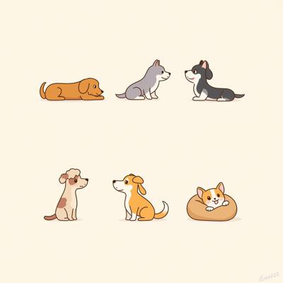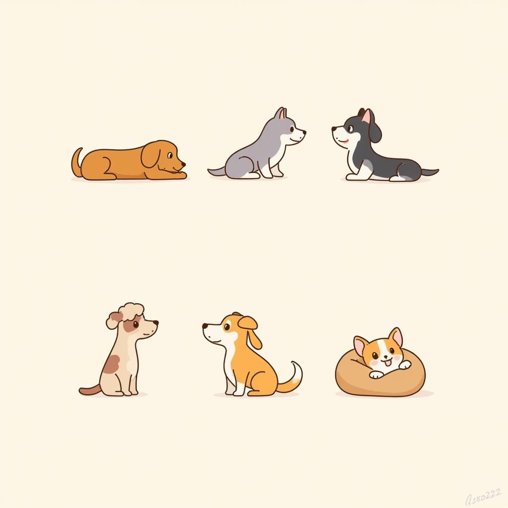 Нарисуй серию из 5 мультяшных иллюстраций с разными породами собак (такса, хаски, пудель, чихуахуа, корги). Каждая — в расслабленной позе (лежит, сидит, наклоняется, с поднятой лапой, свернулась клубком). Стиль: плоские цвета, четкие контуры, минимализм; светлый бежевый или кремовый фон; дружелюбное мордашка, мило и мультяшно, с румянцем. Добавь по 3–5 декоративных элементов: облака, звёзды, травка, горы, точки. Цвета мягкие, пастельные, шерсть — по породам, но мультяшные. Иллюстрации — радостные, простые, без градиентов.