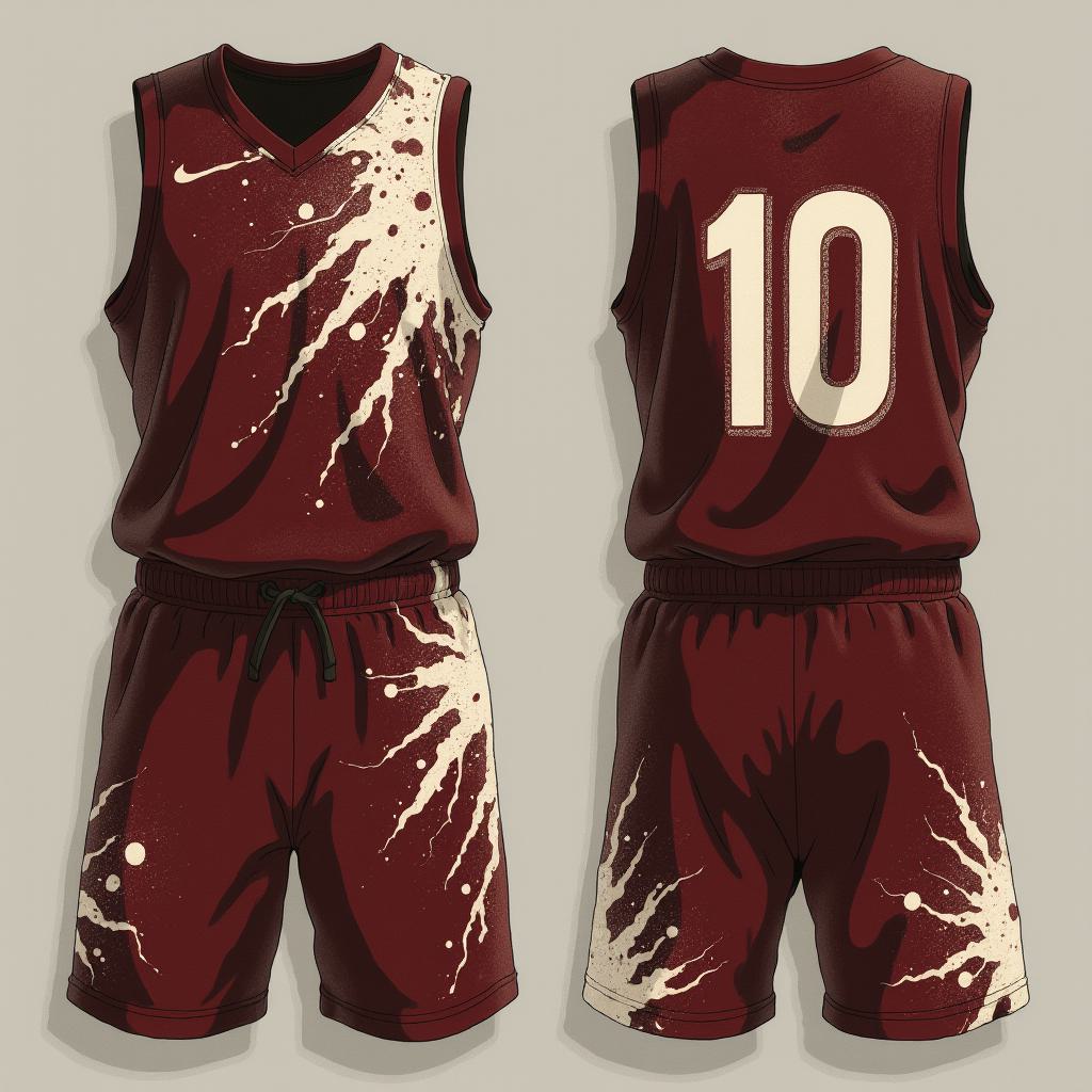 A techwear basketball uniform flat lay, front and back view. Deep burgundy maroon base with a torrent of glowing white data streams and fragmented geometric shapes. A sharp monochrome pixel storm effect erupts on one shoulder and flows down the shorts. The numbers are distorted with a digital glitch effect in white and light grey. Isolated on a dark background, no human, concept art, cyberpunk aesthetic, high contrast.