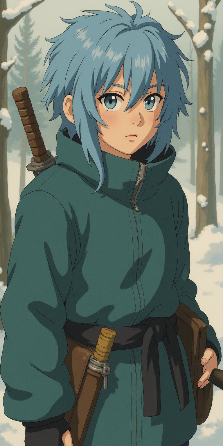 Нарисуй мужчину-ниндзя из страны Морозного Болота из альтернативной вселенной "Наруто". Описание персонажа: "28 лет. Телосложение среднее, атлетическое, но без излишней мускулатуры. Волосы холодно-синего цвета, немного растрёпанные, средней длинны, с несколькими прядями, падающими на лицо. Глаза глубокие, тёмно-синие, с холодным, внимательным взглядом. Высокие скулы, средне-широкое лицо, ямочки на щеках."