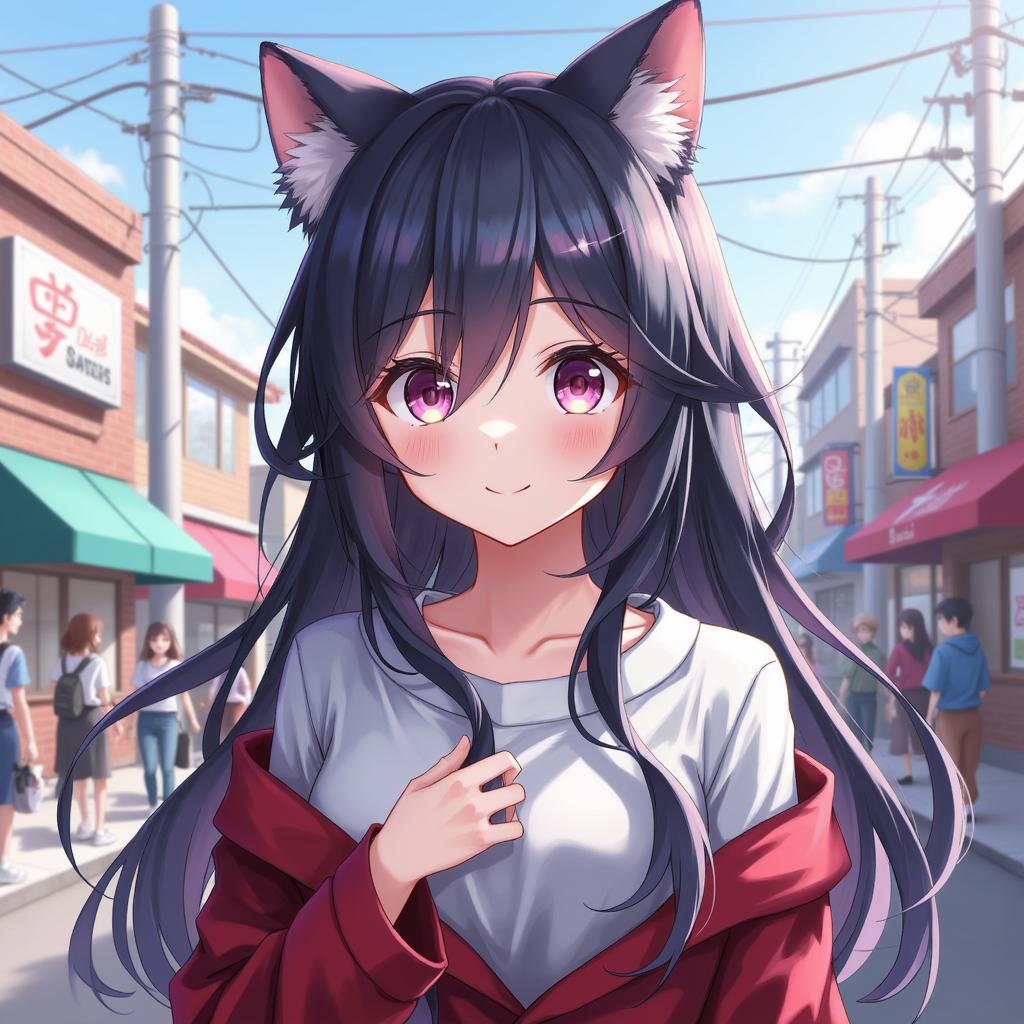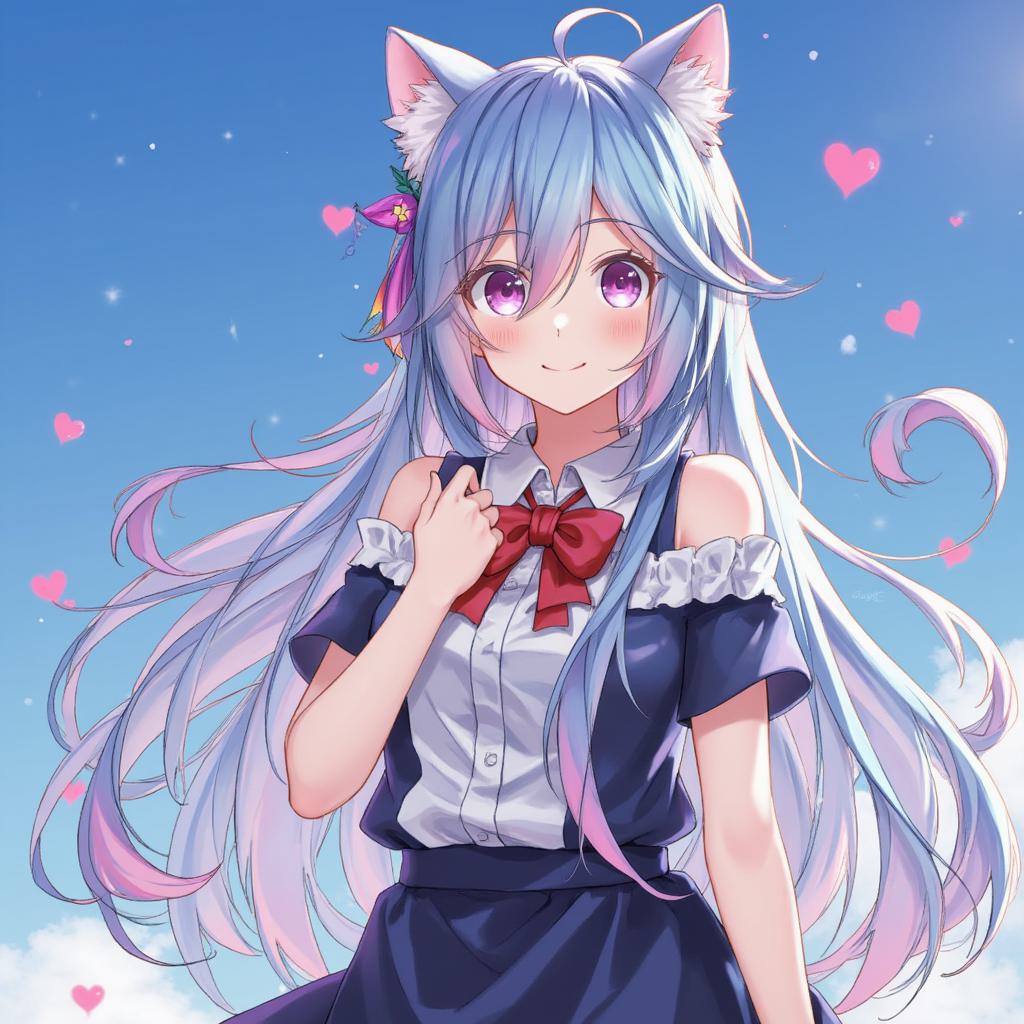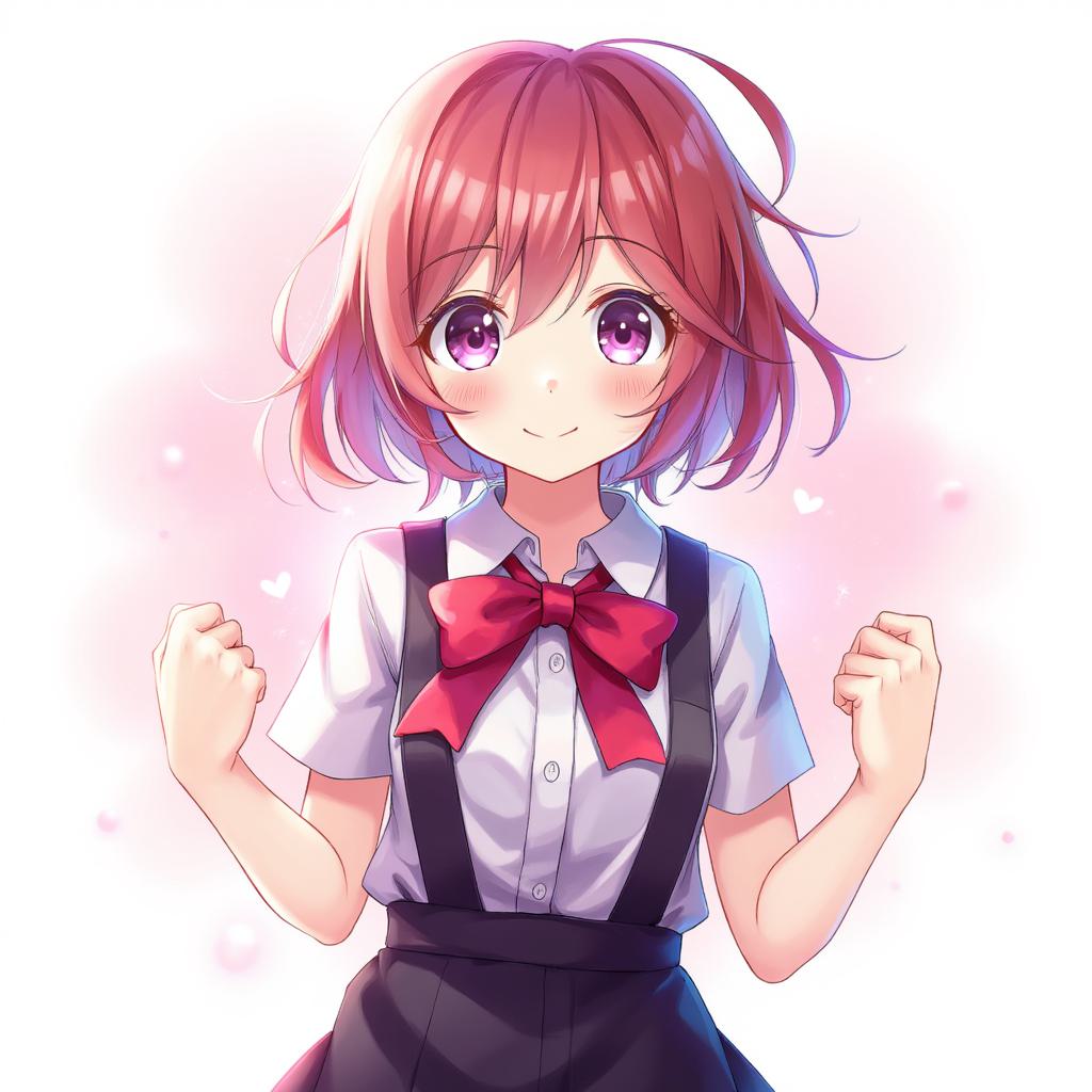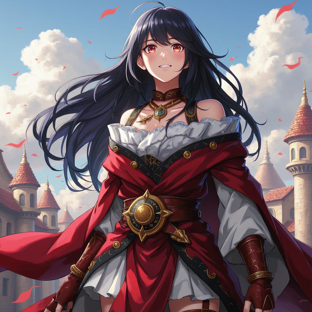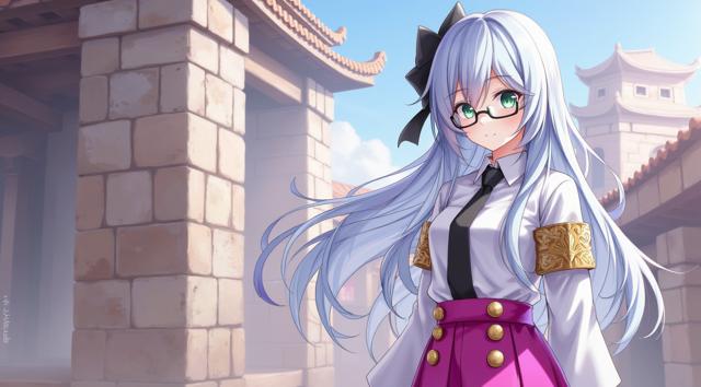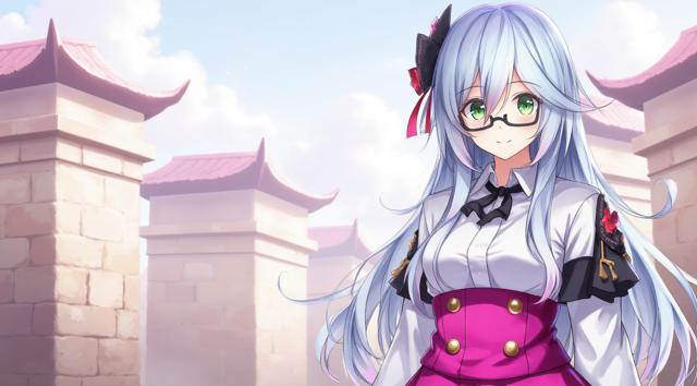 На изображении изображен персонаж с длинными белыми волосами, зелеными глазами, черными очками, который носит белую рубашку с черным галстуком и розовую юбку с золотыми кнопками, на макушке головы черный бант. Она стоит с уверенным выражением лица, на фоне старинной архитектуры с каменными стенами и крышей из черепицы. Задний план дополнен зелеными деревьями и величественными горами, создавая контраст между природой и построенной средой. Освещение мягкое и естественное, что создает теплую атмосферу. У персонажа выдающиеся формы тела. Композиция сбалансирована, с акцентом на главном персонаже, который занимает центральное место на кадре.