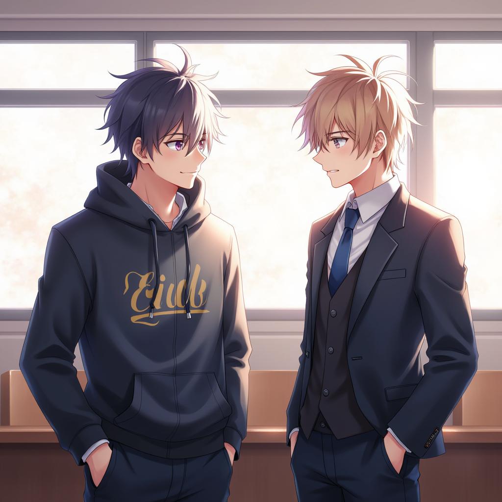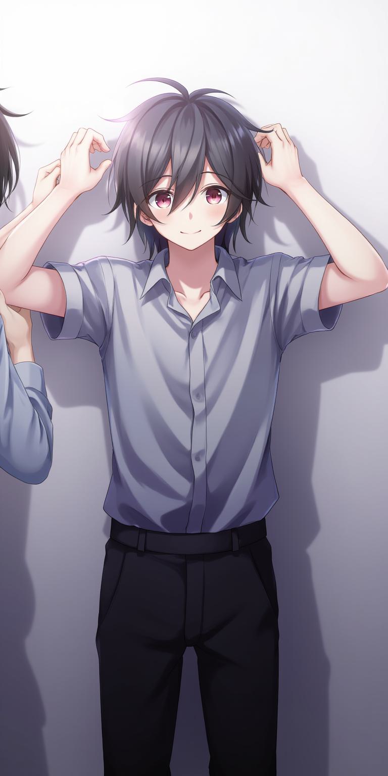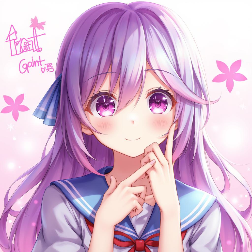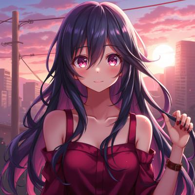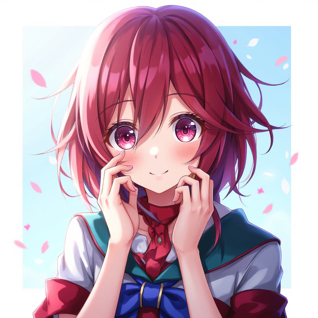 На изображении изображен персонаж с длинными белыми волосами, зелеными глазами, черными очками, который носит белую рубашку с черным галстуком и розовую юбку с золотыми кнопками, на макушке головы черный бант. Она стоит с уверенным выражением лица, на фоне старинной архитектуры с каменными стенами и крышей из черепицы. Задний план дополнен зелеными деревьями и величественными горами, создавая контраст между природой и построенной средой. Освещение мягкое и естественное, что создает теплую атмосферу. У персонажа выдающиеся формы тела. Композиция сбалансирована, с акцентом на главном персонаже, который занимает центральное место на кадре.