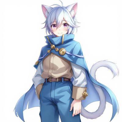 Антропоморфный ( человекоподобный ) белый, АНИМЕ-КОТ, фурри. Лет 18-19., На нём был надет жилет, поверх жилета - светло-голубая с лазурным оттенком накидка с плащом немного изодранным снизу. Она застёгивается на золотистую за-, клёпку. На ногах были одеты светло-голубые штаны расширяющиеся к низу. На руках были надеты нарукавники из древесной коры на одном из которых виднелся свежий зелёный росток на ногах - мягкая чёрная обувь а на голове широкая шляпа, закрывающая лицо обтянутая светло-голубой тканью свисающей сзади и по бокам.