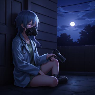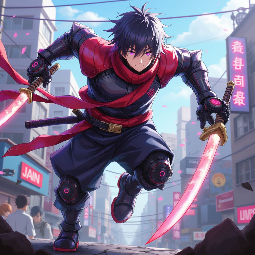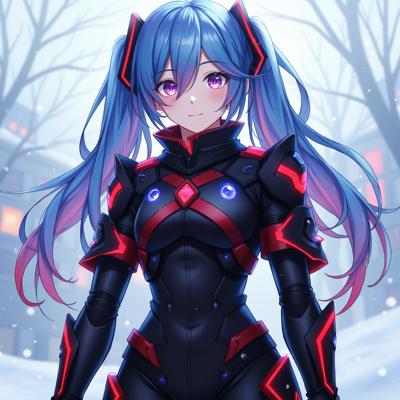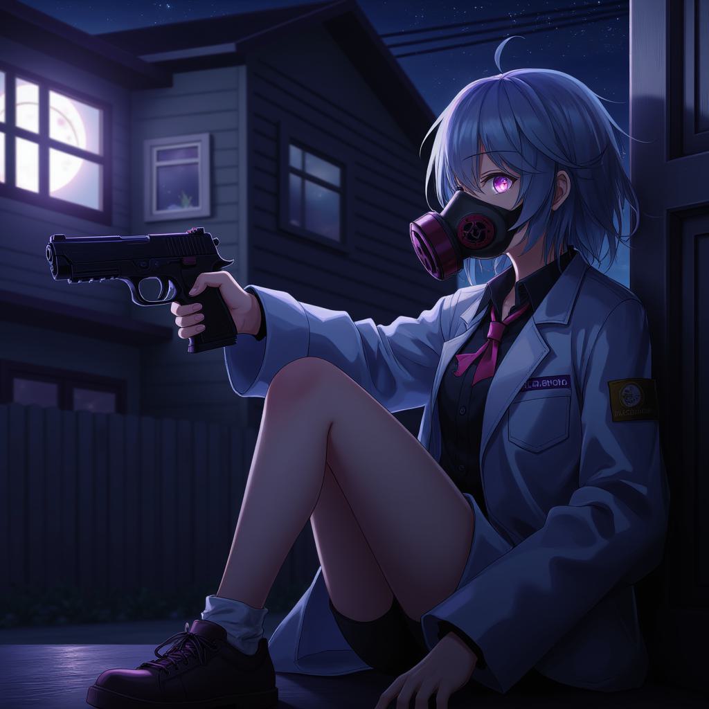 На изображении изображен персонаж с длинными белыми волосами, зелеными глазами, черными очками, который носит белую рубашку с черным галстуком и розовую юбку с золотыми кнопками, на голове черный бант. Она стоит с уверенным выражением лица, на фоне старинной архитектуры с каменными стенами и крышей из черепицы. Задний план дополнен зелеными деревьями и величественными горами, создавая контраст между природой и построенной средой. Освещение мягкое и естественное, что создает теплую атмосферу. Стиль изображения можно охарактеризовать как смесь готического и современного киберпанка. Композиция сбалансирована, с акцентом на главном персонаже, который занимает центральное место на кадре.