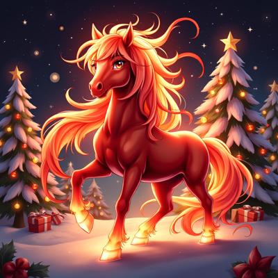 Лошадь должна быть динамичной и энергичной, с яркими огненными оттенками — красным, оранжевым и желтым. Добавьте элементы новогоднего декора, такие как снежинки, елочные игрушки и гирлянды, чтобы создать атмосферу праздника. Фон может быть темным, чтобы огненные цвета лошади выделялись еще больше. Принт должен быть ярким, позитивным и вдохновляющим, идеально подходящим для новогоднего настроения.