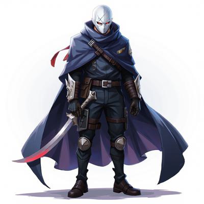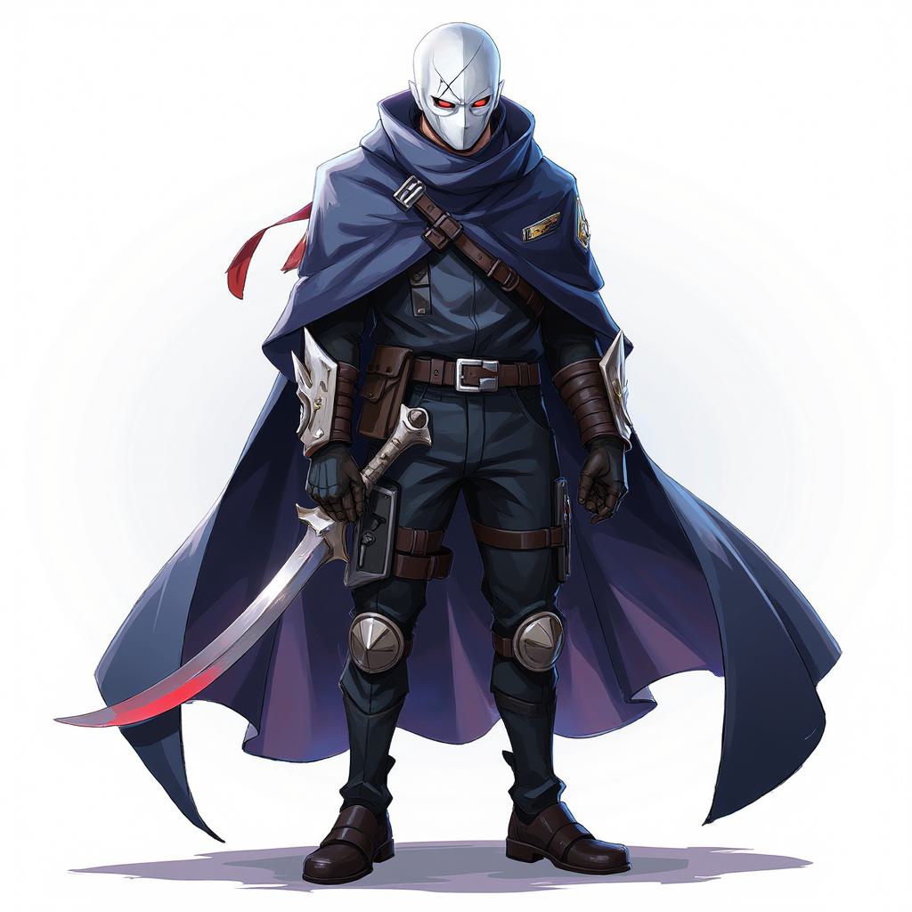 Anime character concept art, full-body orthogonal view. Male, late 20s, 190cm. Lean athletic build with visible bone protrusions on knuckles, forearms, shins. Wears a simple white full-face mask with one subtle crack. Practical dark hooded cloak over tactical clothing. Holds a sharpened bone shard. Exhausted but determined eyes visible through mask slits. Clean line art, plain background. Dark anime aesthetic.