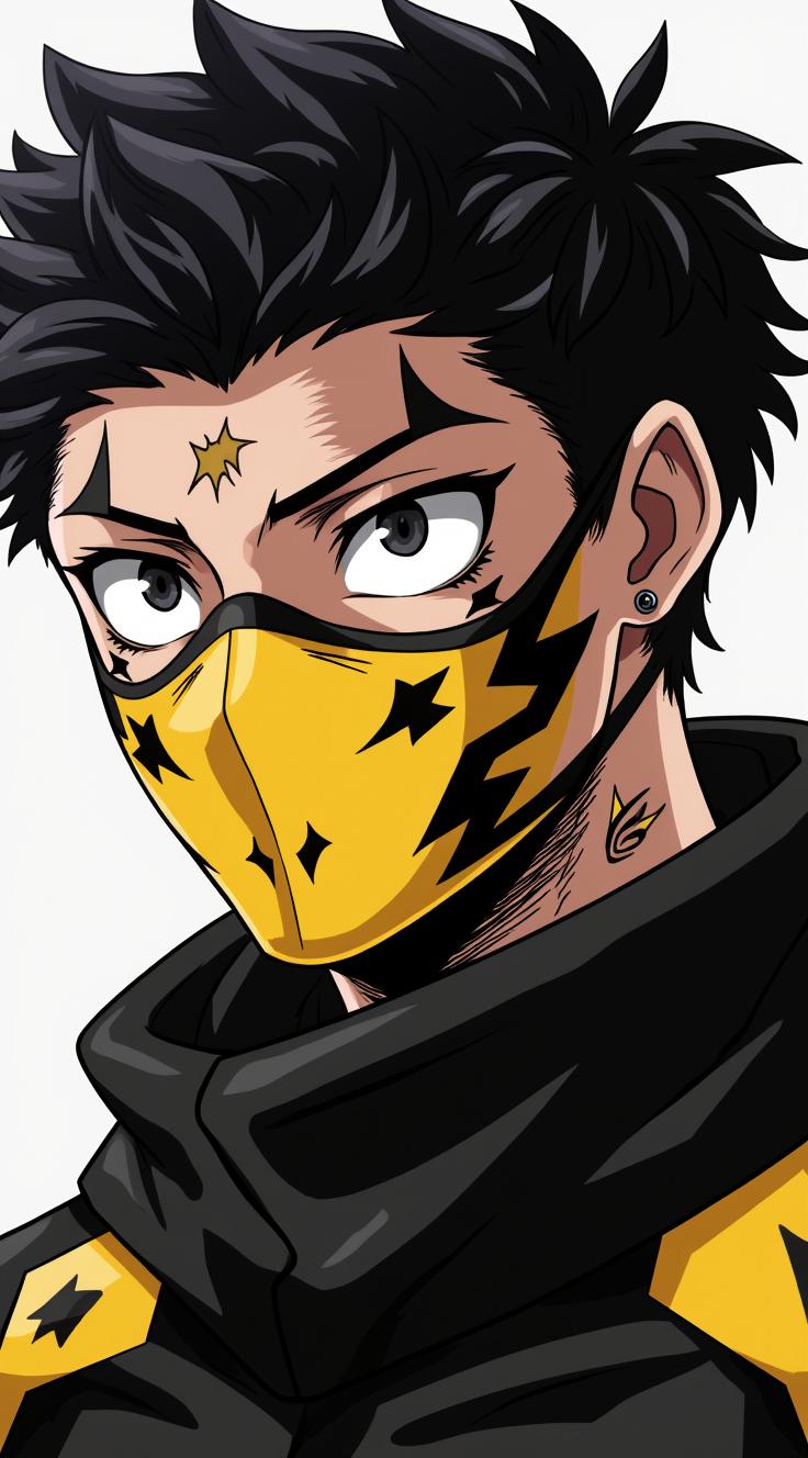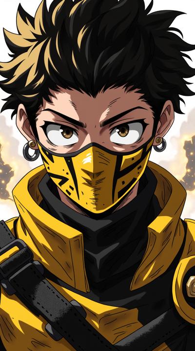 My Hero Academia character design. A teenage boy with a tactical half-face mask. The mask has a **stylized, angular paint job of yellow and black geometric patterns** directly referencing Mortal Kombat's Noob Saibot. His piercings (left ear, right eyebrow) and intense eyes are visible. Dark urban backdrop. No full helmet, no fantasy elements.