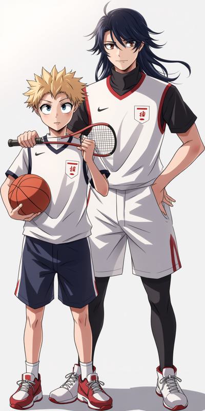 Азиатский невысокий парень блондин с голубыми глазами (далее: Такемичи) в баскетбольной чëрной форме. Такемичи держит в руке теннисную ракетку. Рядом с Такемичи стоит азиатский высокий парень с черными длинными волосами и тëмными глазами с нахальной обаятельной ухмылкой (далее: Баджи). Баджи в форме теннисистов. Баджи нахально улыбается в камеру. У Баджи длинные чëрные волосы ниже груди. Парни стоят рядом друг с другом. Под одной ногой у Баджи баскетбольный мяч. На фоне теннисный корт.