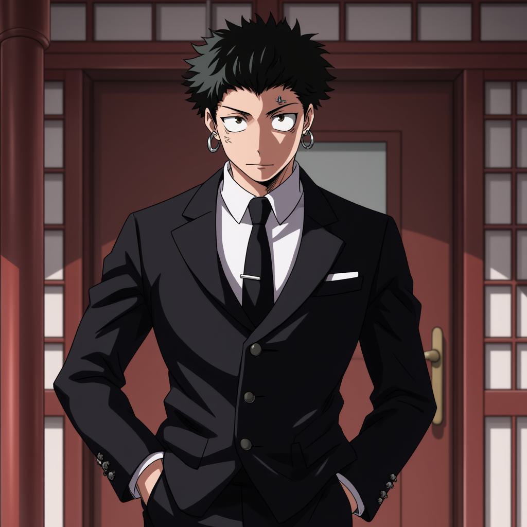 My Hero Academia official art style, full-body portrait of Yuta Tanaka as a elite bodyguard. He wears a sleek modern black suit. Short, neat black hair. A silver eyebrow piercing and multiple silver earrings in one ear. He stands protectively near a traditional Japanese office door, his expression is calm but alert. A faint glow of his Quirk activation around his hand. Dynamic anime pose, vibrant colors, detailed background.