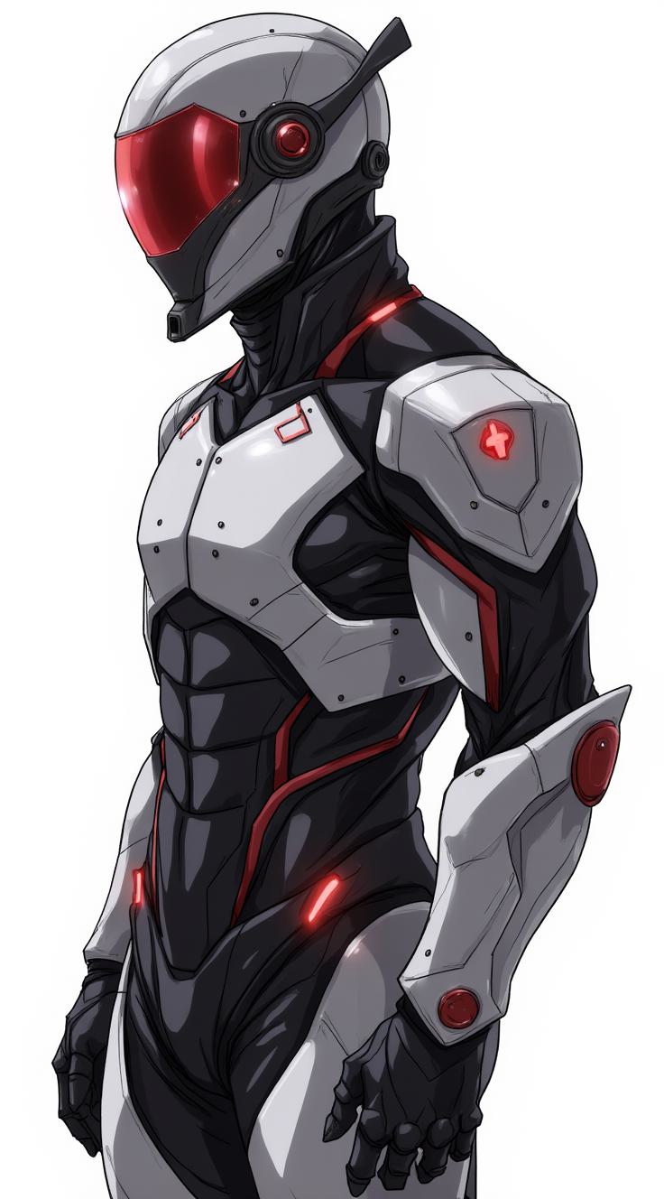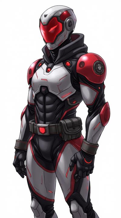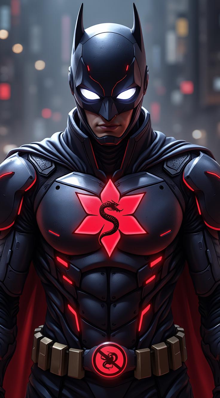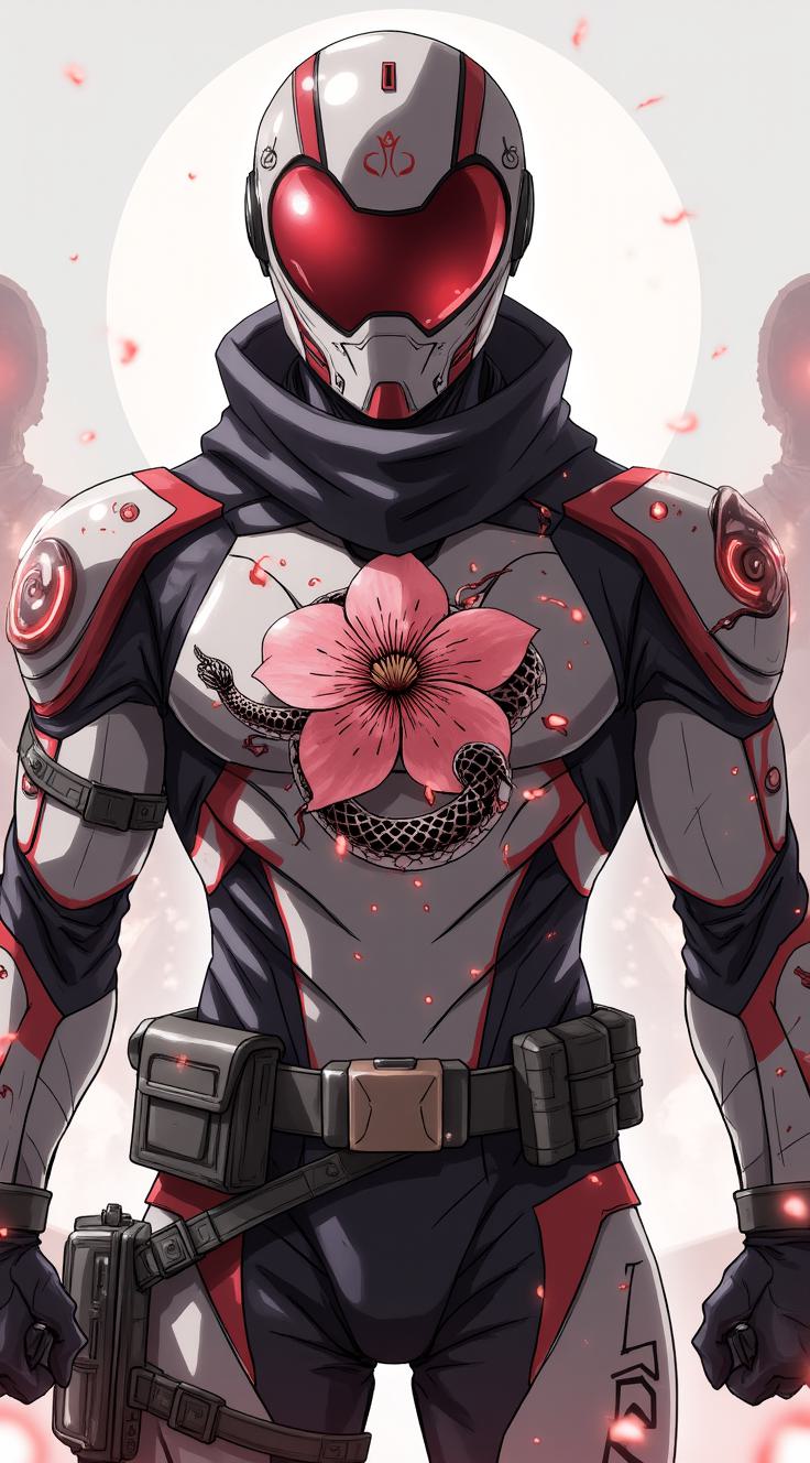 персонаж в высокотехнологичном костюме, напоминающем Бэтмена. Область лица, закрытая шлемом, светится красным цветом, и видны два светящихся белых глаза., , На груди бронированный элемент, в центре которого расположен стилизованный символ, состоящий из цветка сакуры и обвивающей её черной змеи. Костюм имеет темную цветовую схему, состоящую из черных, серых и темно-красных элементов., На поясе персонажа закреплено различное тактическое оборудование и подсумки.