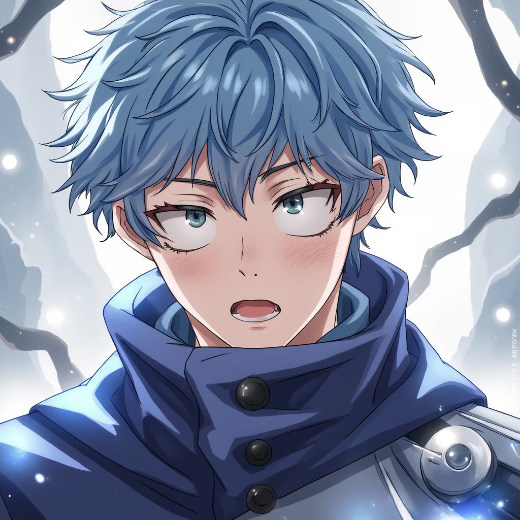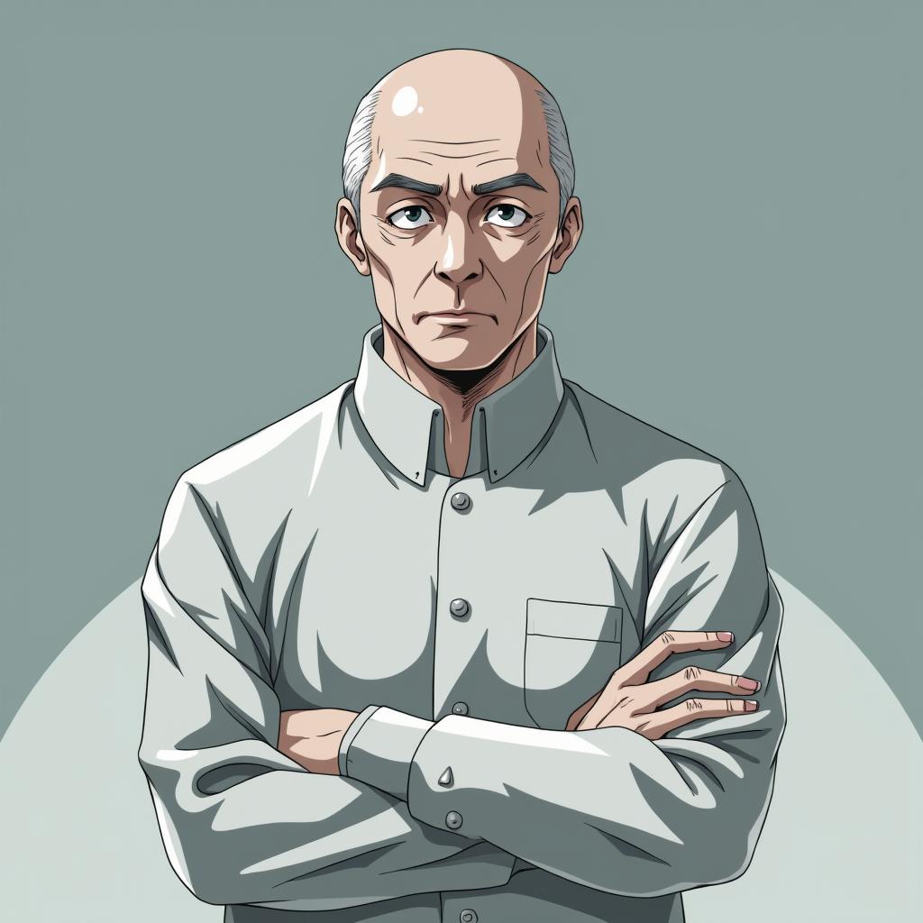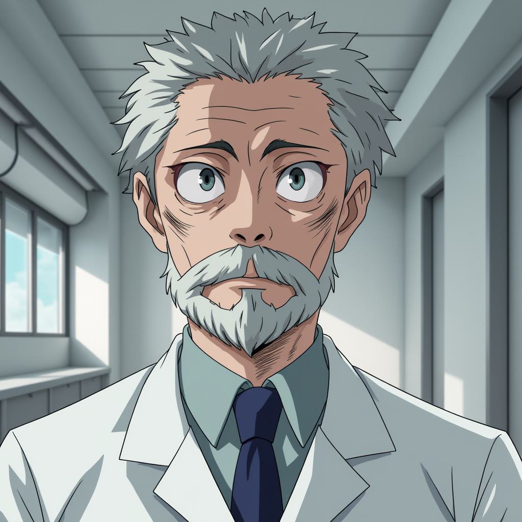 Доктор Такэо Сибата, мужчина средних лет, восковая кожа лица и рук, аномально гладкая, без пор. Мутно-голубые, влажные глаза с неподвижным, пронизывающим взглядом. Медицинский халат, строгий кабинет Центра Регистрации. Гетероморфная причуда «Анатомический Атлас». Выражение лица — маска профессиональной отстранённости, но в уголках глаз и губ — глубокая, накопленная усталость и скрытый цинизм. Взгляд направлен мимо зрителя, будто видит не лицо, а внутреннюю биомеханику. На столе — компьютер, документы, рядом — старый кнопочный телефон. Реализм, психологический портрет, тёмная цветовая палитра, мрачная атмосфера кабинета. Стиль: My Hero Academi, налёт киберпанка и нео-нуара.