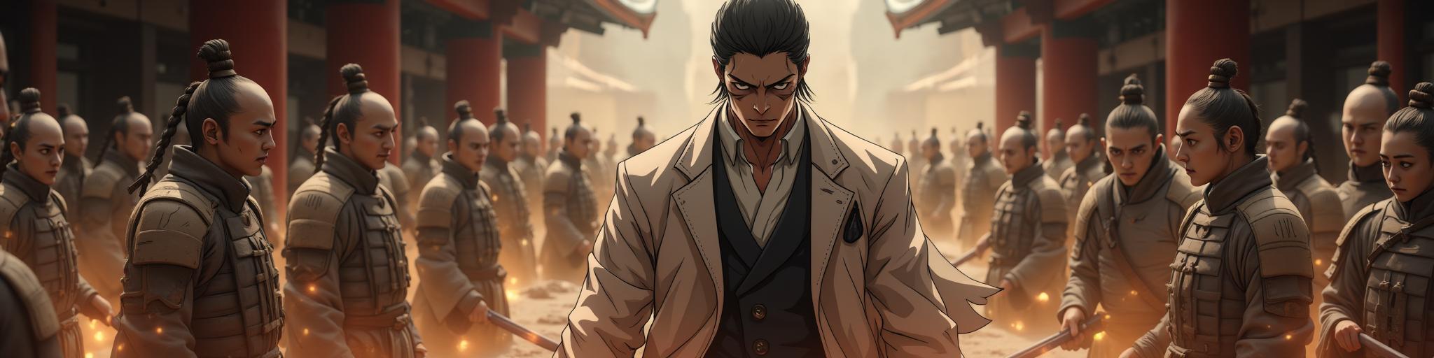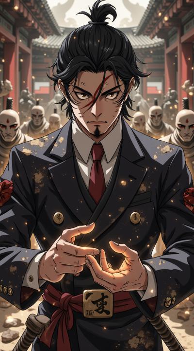 portrait of a dangerous antihero, Japanese man (Yuta Tanaka) with sharp features and piercing eyes, wearing a torn expensive suit, standing in a derelict traditional dojo, spectral translucent clay samurai warriors forming from dust and debris around him, his hands cracked like dry earth with glowing amber light, moody dark atmosphere, volumetric fog, single ray of light, dark fantasy, masterpiece, intricate detail, character concept art, style of Artgerm and WLOP, dark color palette of black, grey, terracotta orange, and gold --ar 3:4 --style raw