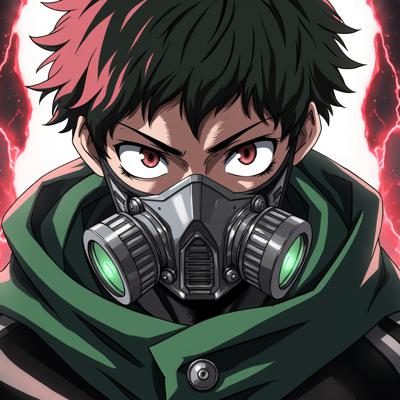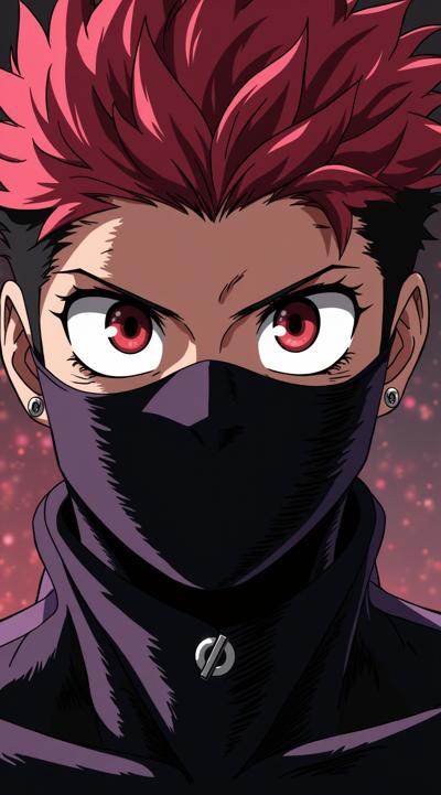 My Hero Academia style portrait of a teenage boy with a tactical lower face mask. The mask is a sleek, form-fitting piece of black tactical gear that molds to his nose, mouth, and jawline like a armored fabric or reinforced neoprene. His intense eyes, eyebrows with a silver ring, and piercings in his left ear are prominent. Dark, vibrant colors. Avoid: gas mask, canister, hose, full face cover.