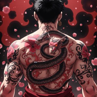 masterpiece, best quality, anime art, tattoo of the "serpent and sakura" on the back of a yakuza elite, the tattoo is intricate and large, the serpent is coiled menacingly, its fangs bared, the sakura petals are falling and dissolving into shadowy smoke, skin is slick with sweat, dimly lit traditional tatami room, style of My Hero Academia, hyper-detailed ink work