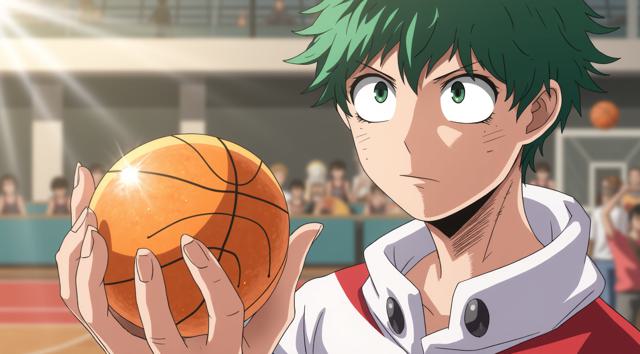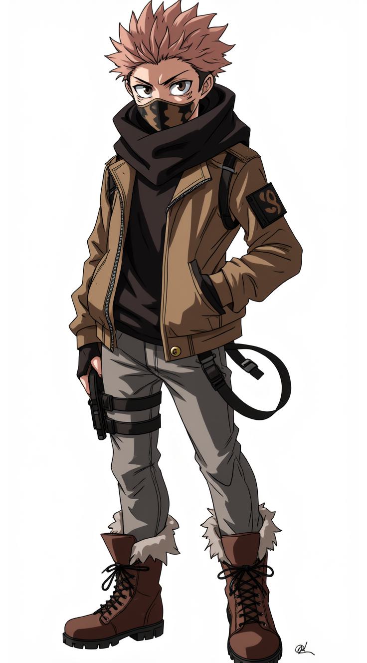 My Hero Academia character design, full-body shot. A teenage boy in a tattered jacket and combat boots. His face is covered by a tactical mask that conceals his forehead, nose, mouth, and jaw, revealing only his intense eyes and hair. The mask features a geometric brown-and-black paint scheme reminiscent of Mortal Kombat's Noob Saibot. Silver piercings are visible in his left ear and right eyebrow. Dynamic pose, cyberpunk urban background. No gas mask, no full helmet.helmet, no fantasy elements.