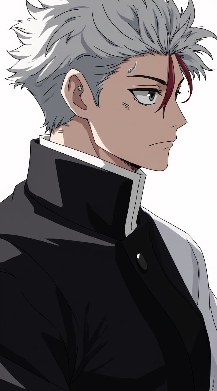 Full-body portrait of a male Shinigami from Bleach, a young nobleman. His hair is well-groomed and stylish, but with one temple sharply shaved close to the skin, contrasting with the rest. A silver ring piercing adorns his right eyebrow. He wears the standard, pristine black Shinigami shihakusho uniform without any alterations, signifying his noble status and discipline. Over it, he wears the white Lieutenant's haori correctly.