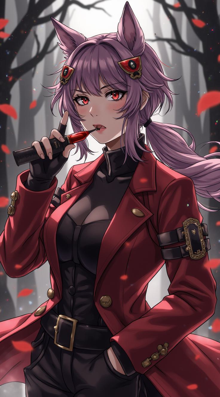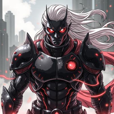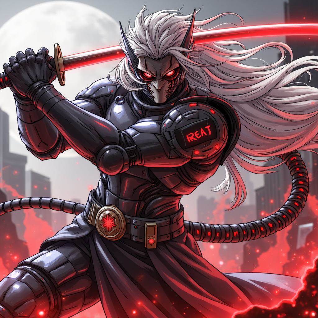 Киберпанк-демон в динамичной боевой стойке, симбиоз Думгая и Райдена. Тяжелая броня Претора с элементами черного кибернетического экзоскелета, длинные белые синтетические волосы развеваются на ветру. Шлем Палача Рока, но с видимой нижней челюстью киборга. В правой руке катана, охваченная красным адским пламенем, на левом предплечье энергетический клинок. На фоне марсианская база в огне и адские врата. Мрачно, эпично, фотореализм.