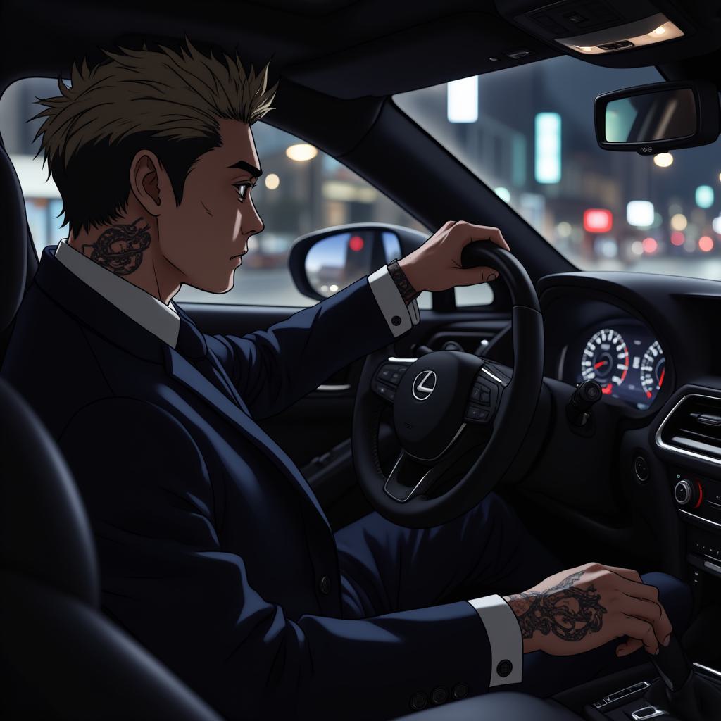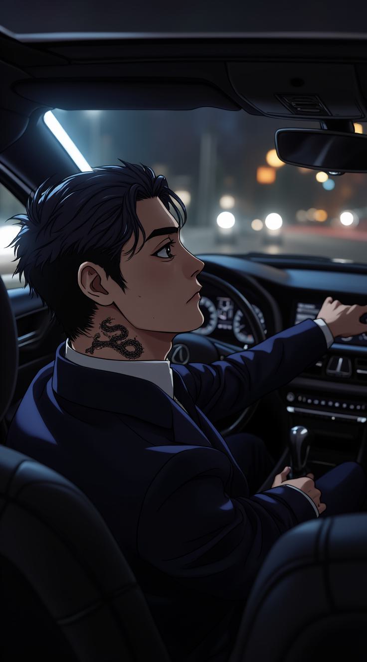 A man in his late thirties, Japanese, sharp and calculating features with short hair. He reclines in the plush backseat of a black Lexus at night, lit by dashboard lights. He wears an impeccably tailored three-piece suit. A glimpse of an old, fully black snake-and-cherry-blossom tattoo on his left forearm under the cuff. A vibrant, colored tattoo of the same design is clearly visible on his neck. His gloved fingers rest on the leather upholstery. Neo-noir atmosphere, cinematic lighting, photorealistic, hyperdetailed, shallow depth of field. Style of a Japanese crime drama.
