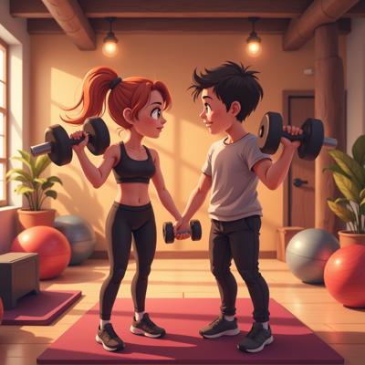 Милая пара занимается спортом в уютном спортзале. Девушка и парень вместе поднимают гантели и делают упражнения. Атмосфера тёплая, романтичная и дружелюбная. Вокруг крупные спортивные элементы: большие яркие гантели, фитнес-мячи , мягкие коврики, тренажёры. На заднем плане чётко видны стены спортзала с большими окнами, зеркалами и спортивными постерами, никаких кухонных элементов. Стиль — мультяшная, пастельная, уютная иллюстрация.